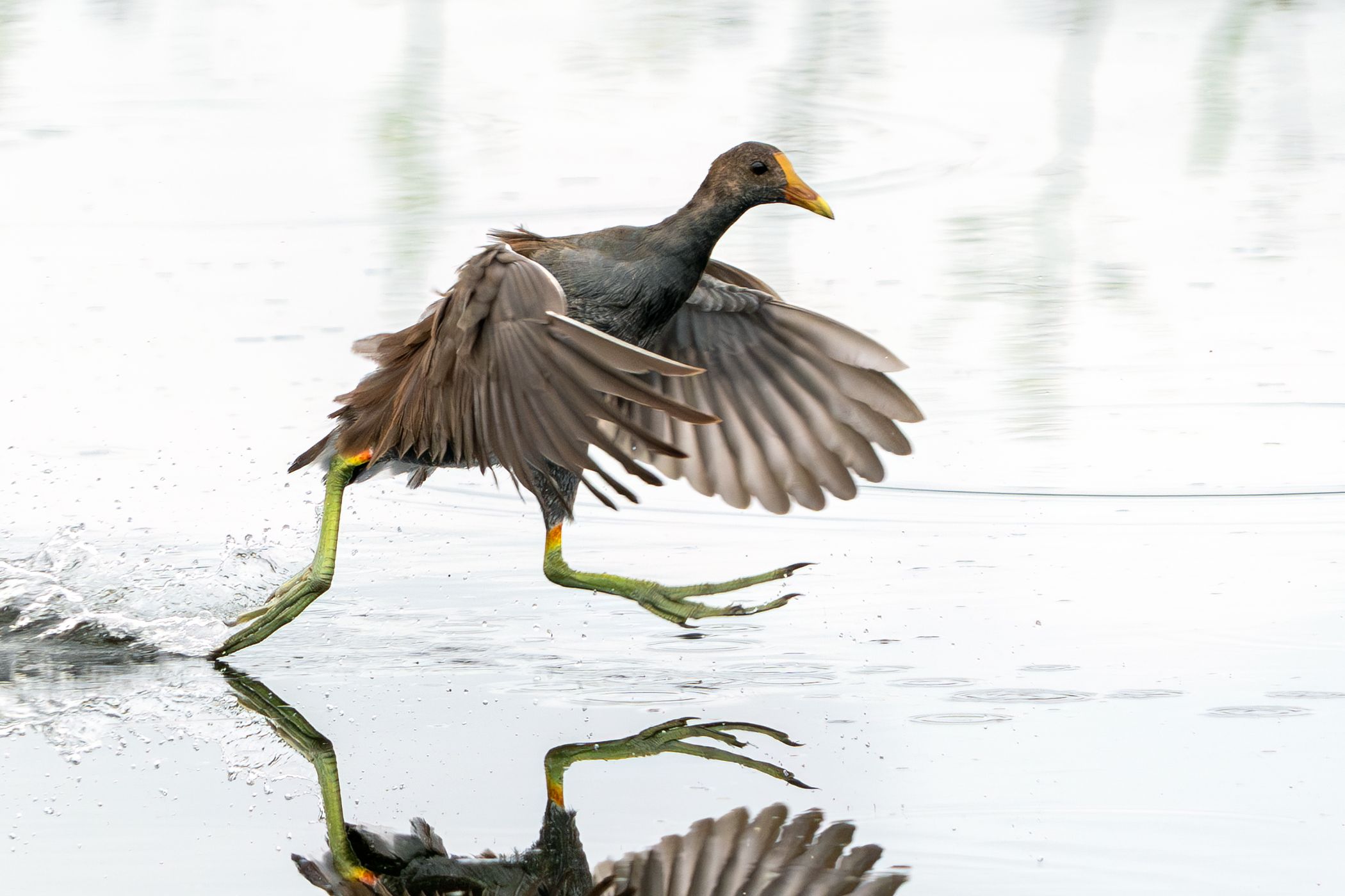 A common gallinule runs across the water to escape a nearby alligator at Green Cay Nature Center in Boynton Beach, Florida on September 4, 2025. Unlike most waterbirds, gallinules have long toes that allow them to walk on floating vegetation. The species is known for its loud, cackling calls that often echo through wetlands. (Photo by Ronen Tivony/NurPhoto/Rex Features/Shutterstock)