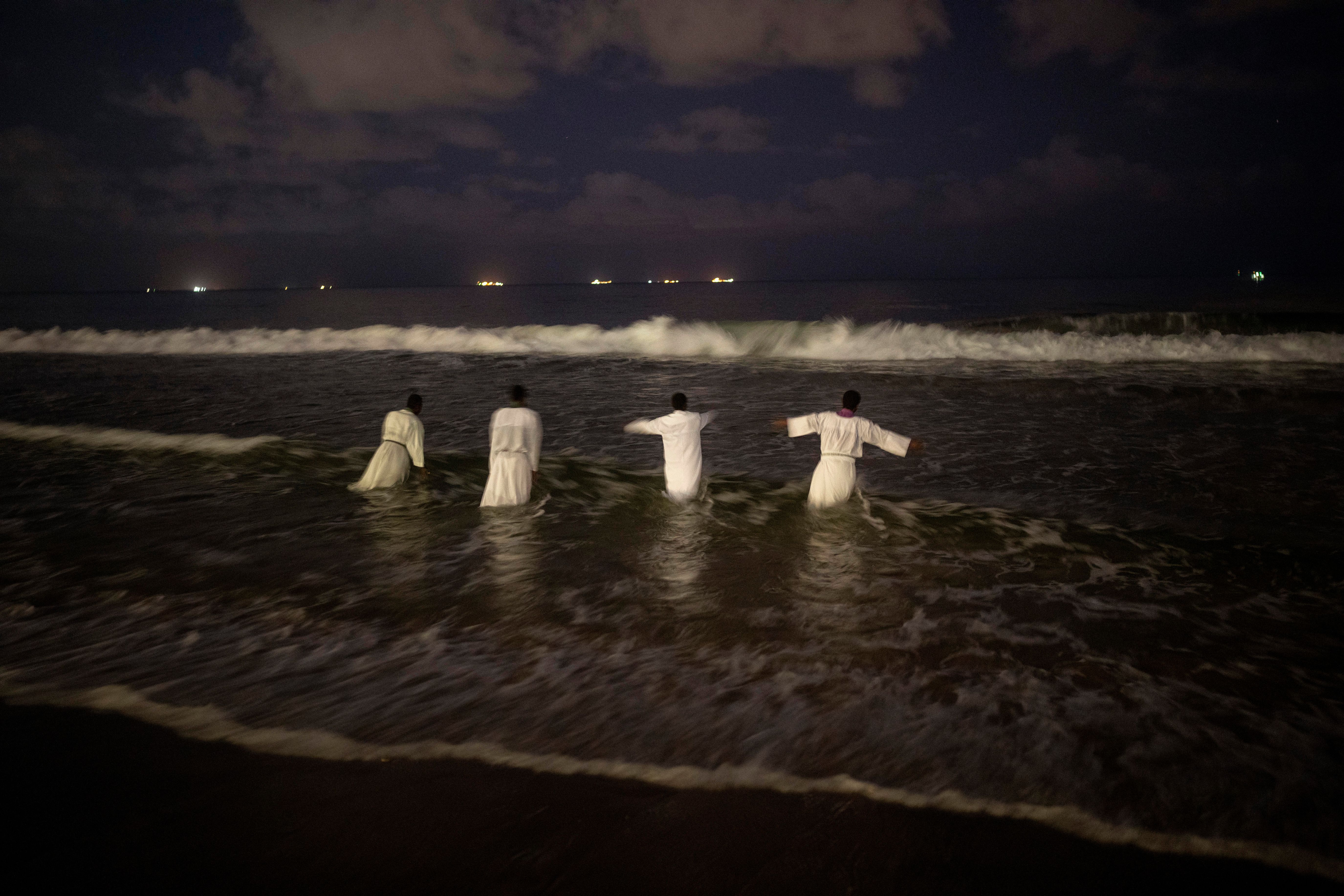 Priests from Intokozo Yamakrestu Church in Christ step into the sea before baptizing the faithful on a beach in Durban, South Africa, Monday, May 27, 2024. (Photo by Emilio Morenatti/AP Photo)