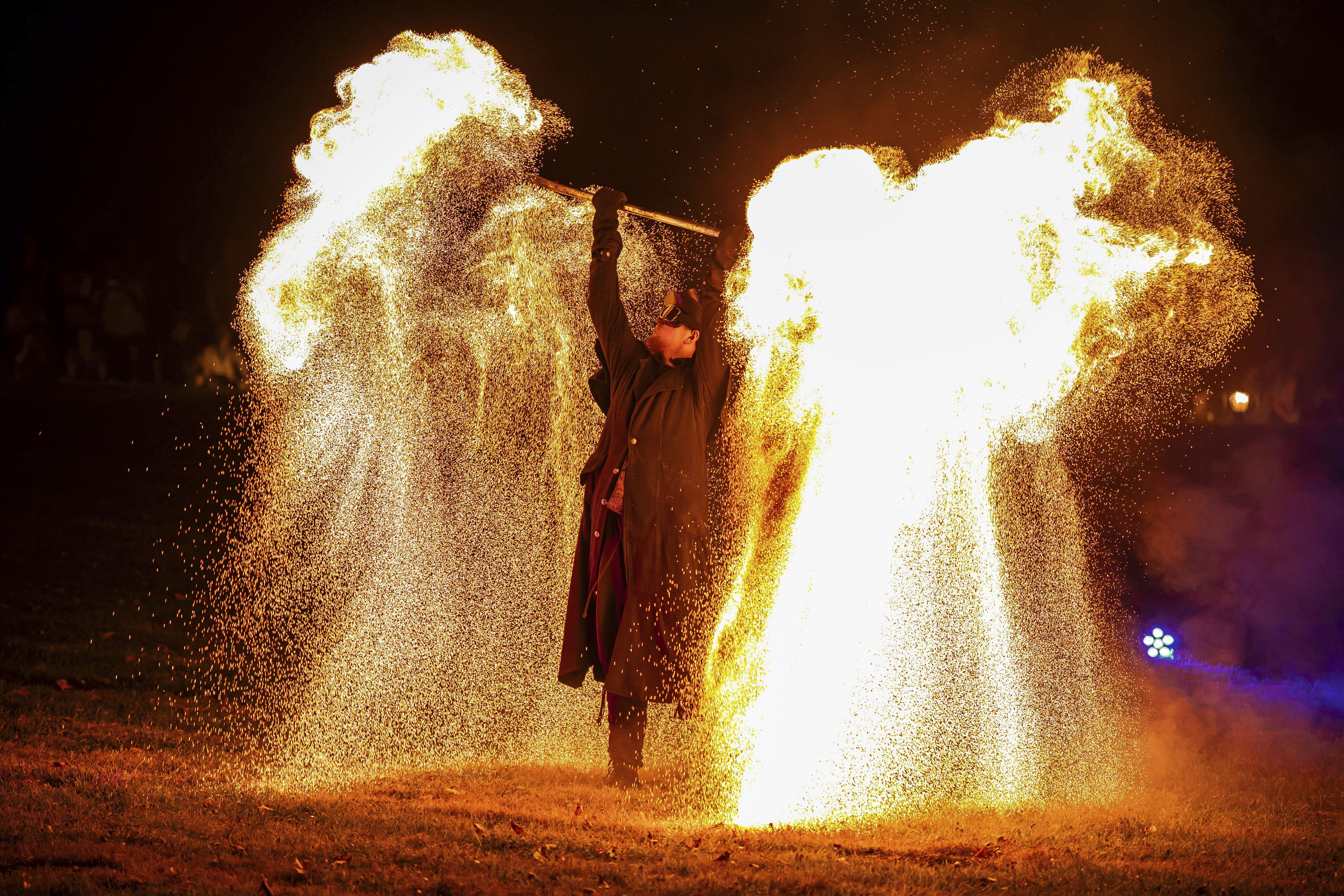 A man performs a pyrotechnic show at the Palace of Versailles before the fireworks display in Versailles, outside Paris, Friday, August 15, 2025. (Photo by Aurelien Morissard/AP Photo)