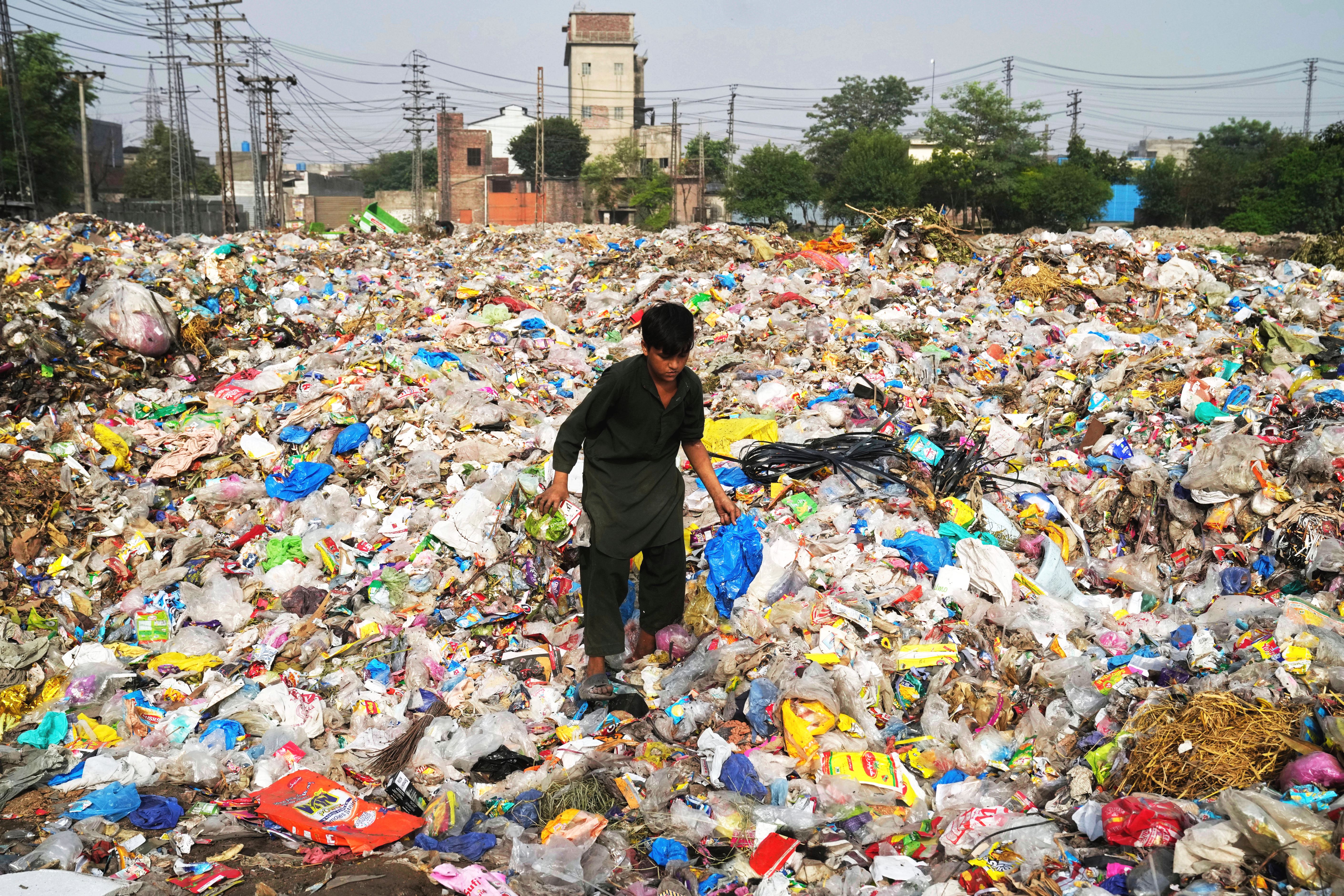 A scavenger collects recyclable items including plastic from a dump site in Lahore, Pakistan, Thursday, August 7, 2025. (Photo by K.M. Chaudary/AP Photo)