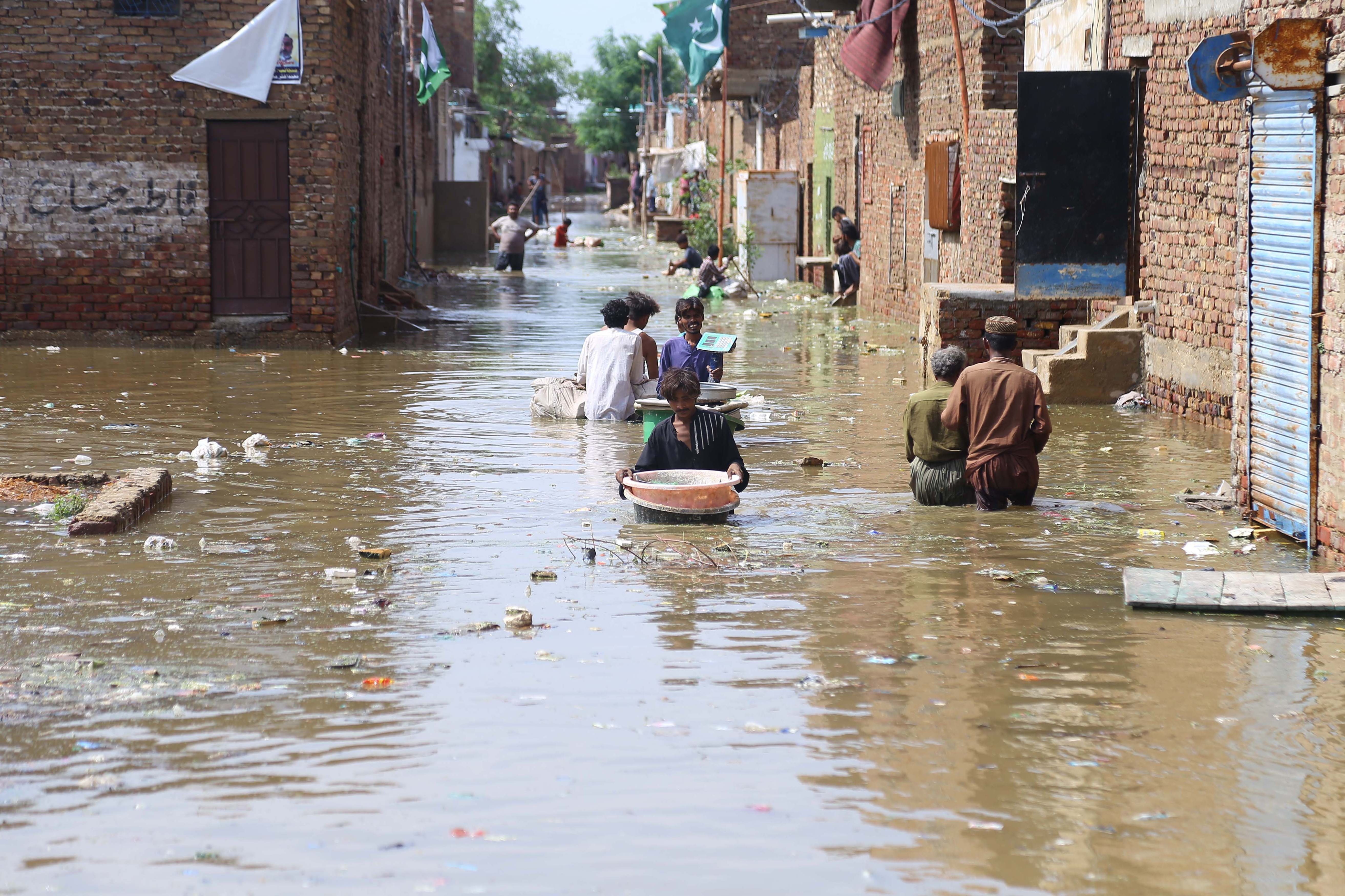 People wade through floodwater after heavy monsoon rains affected residencial areas in Hyderabad, Pakistan, 22 August 2025. According to the National Disaster Management Authority (NDMA), since the beginning of the monsoon season on 26 June the death toll from rains and flooding in Pakistan has reached at least 748 casualties, with 978 people injured. (Photo by Nadeem Khawer/EPA)