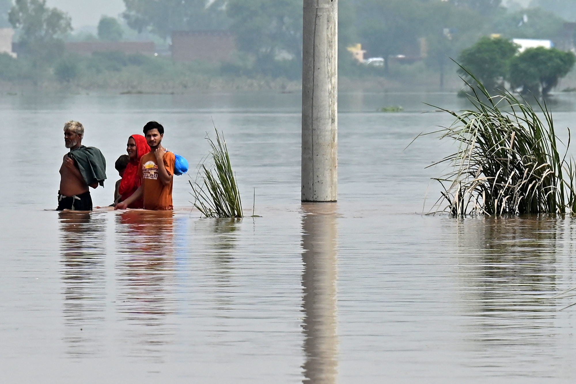 Residents wade through a flooded area of Kartarpur, a town in Punjab province, on August 28, 2025. (Photo by Arif Ali/AFP Photo)