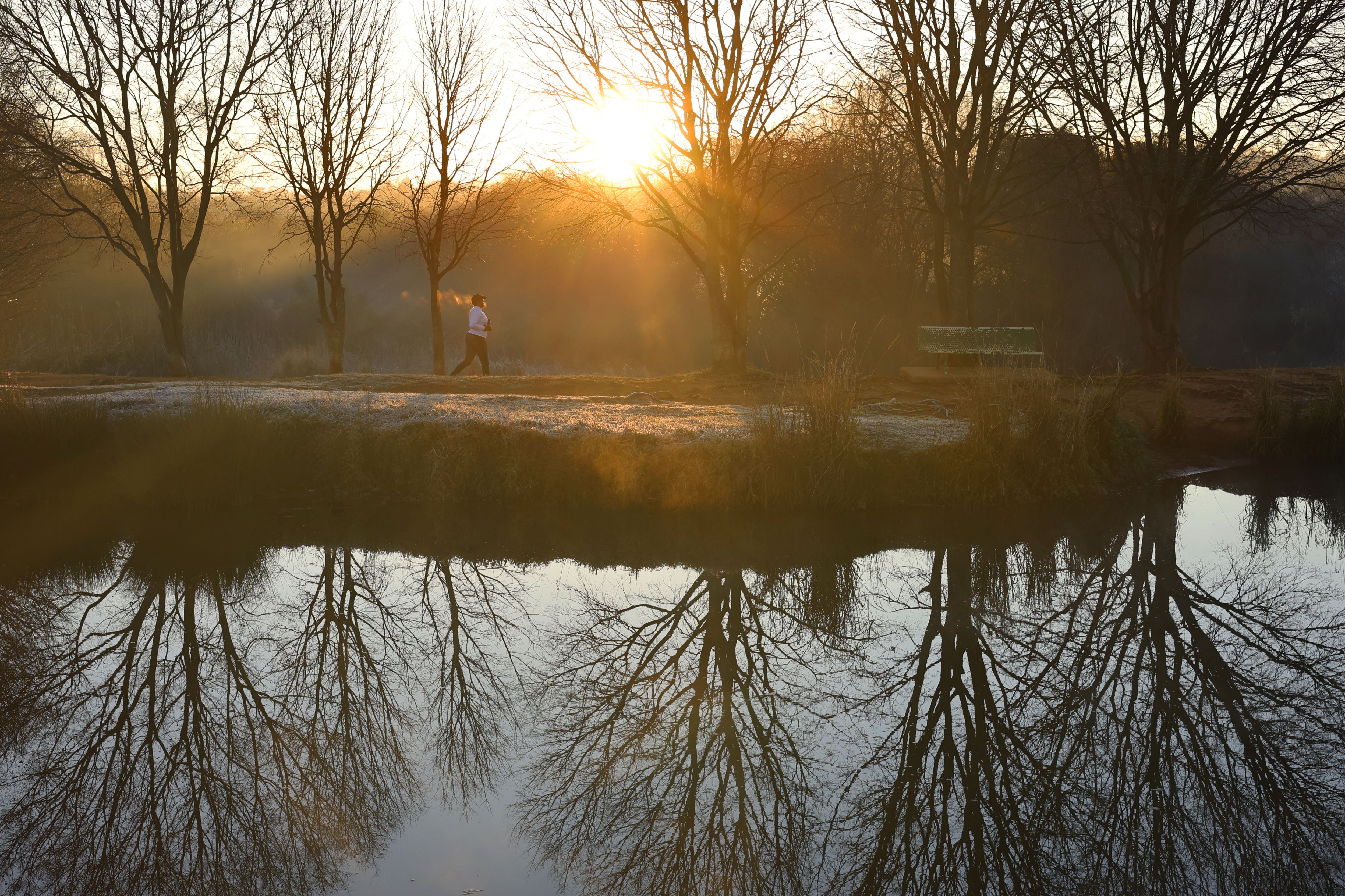 A woman walks in the Emmarentia Park as tress are reflected in a dam and frost covers the ground, in Johannesburg, South Africa, 11 July 2025. Winter temperatures drops to well below zero degrees Celsius at nights as Johannesburg sits at 1750m above sea level. This combined with low winter temperatures causes the frost layers through out the city. (Phoot by Kim Ludbrook/EPA)