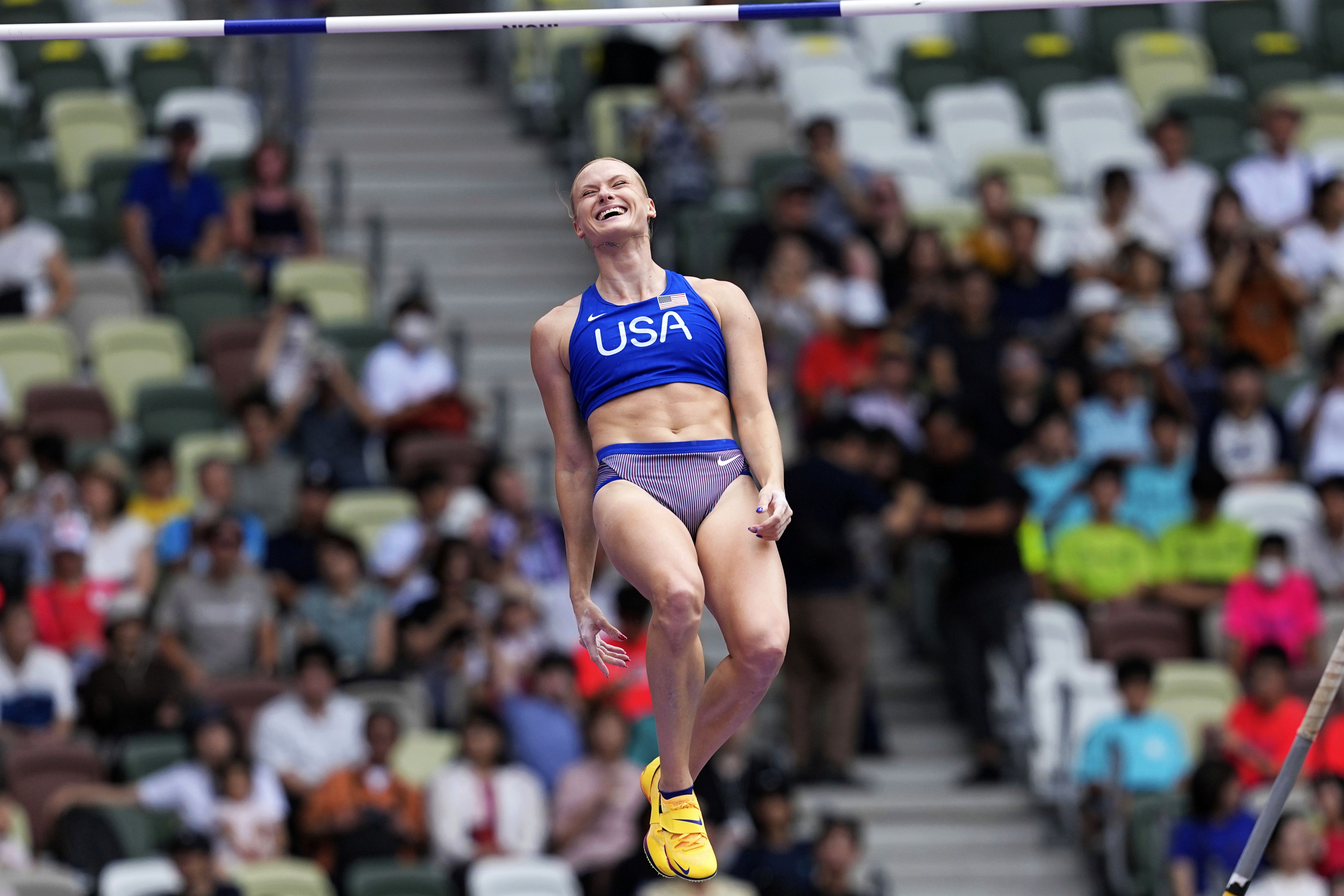 United States' Katie Moon reacts after clearing the bar in the women's pole vault qualification at the World Athletics Championships in Tokyo, Monday, September 15, 2025. (Photo by Matthias Schrader/AP Photo)