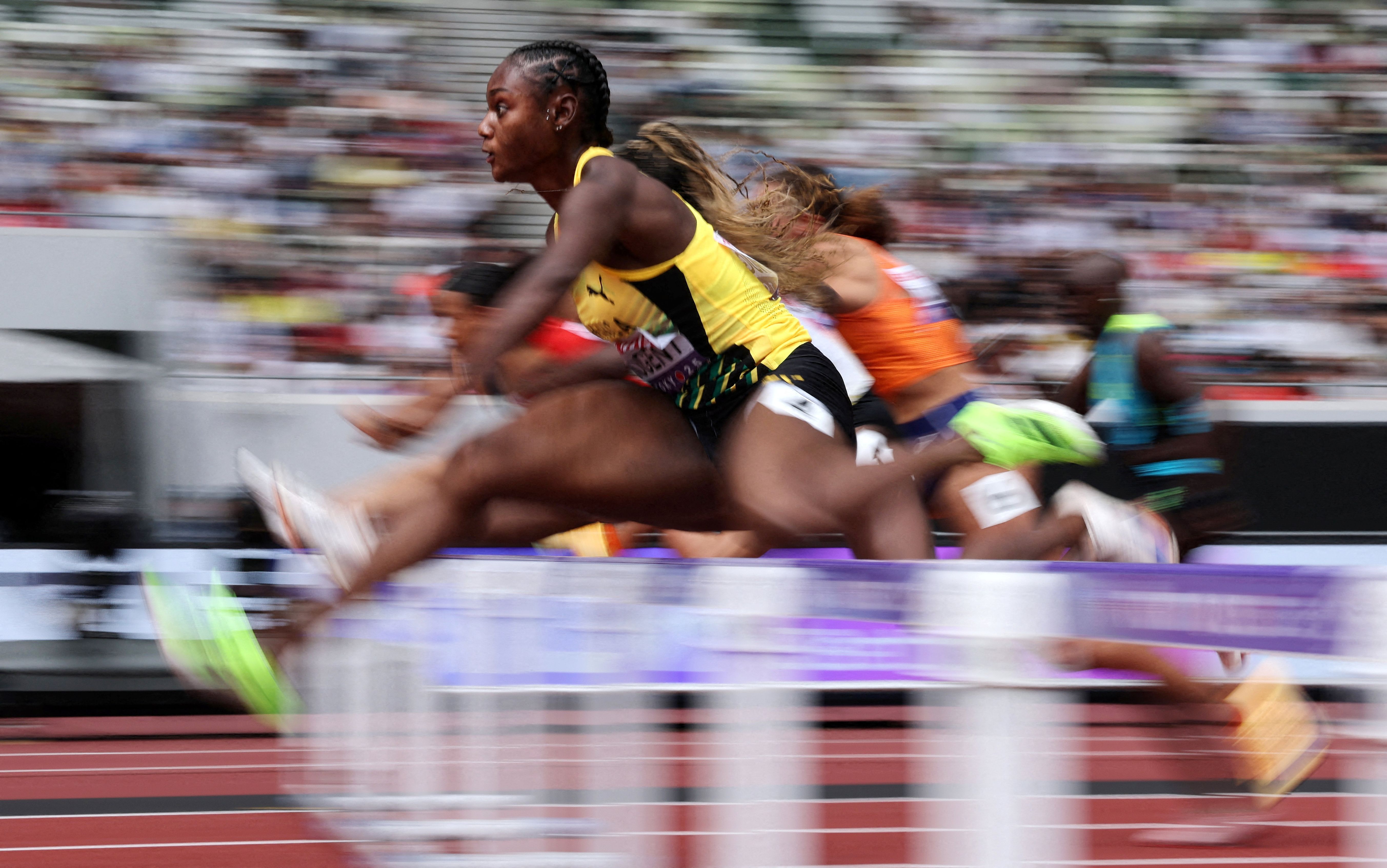 Ackera Nugent of Jamaica in action during the Women's 100m Hurdles Round 1 on September 14, 2025. (Photo by Edgar Su/Reuters)