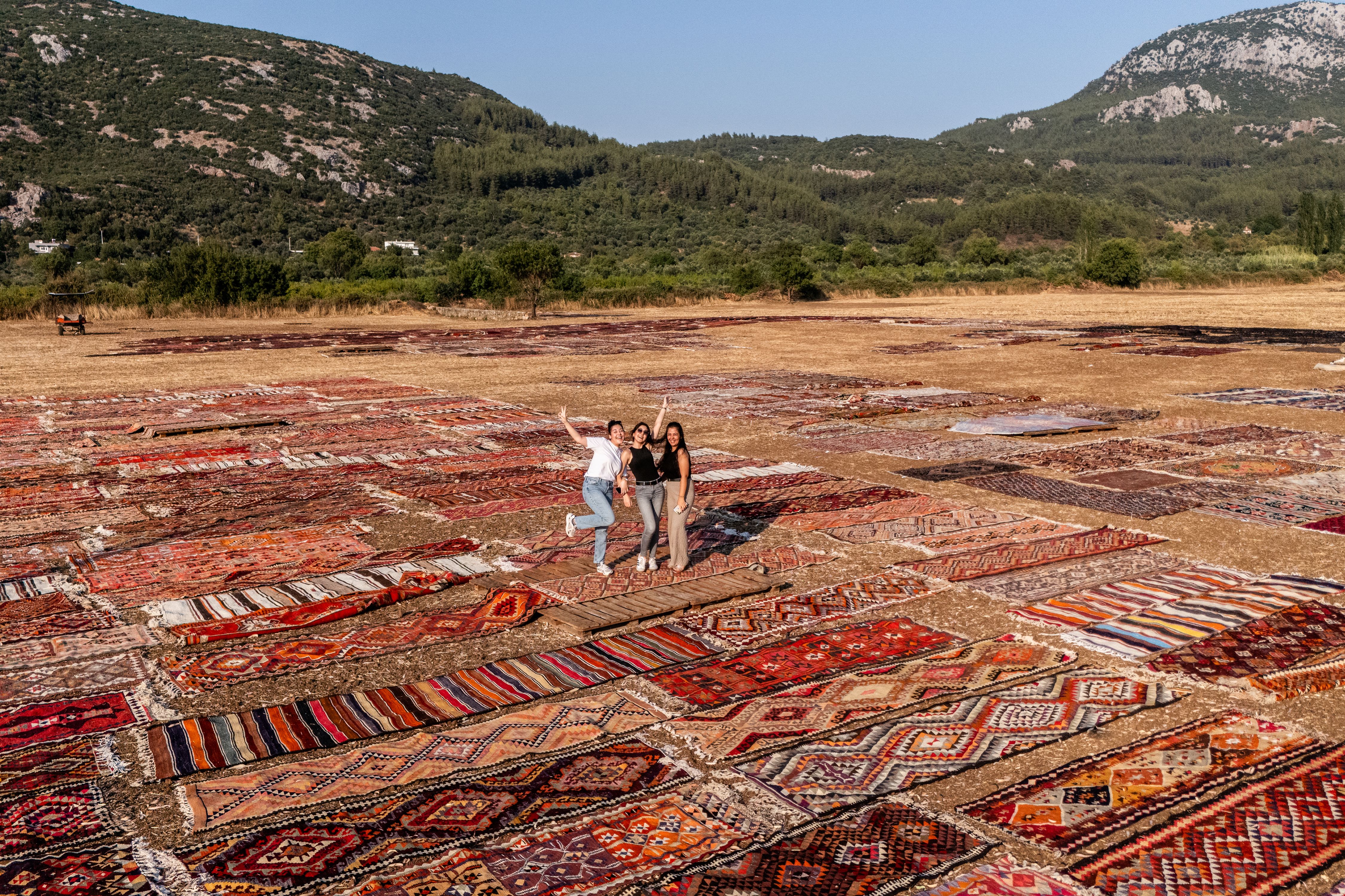 An aerial view shows tourists walking on handwoven carpets laid out in the open fields to soften their colours under sizzling sun in Dosemealti district in Antalya on July 22, 2025. Thousands of carpets and kilims spread out in the sun form a festive and colourful patchwork on the outskirts of Antalya, the large coastal tourist city in southern Turkey. From June to September, in the harvested fields cleared of stubble, traders bring their cargoes to age in the sun, tempering the overly bright hues of their natural colours under its rays and ridding them of any unwanted elements. (Photo by Ozan Kose/AFP Photo)