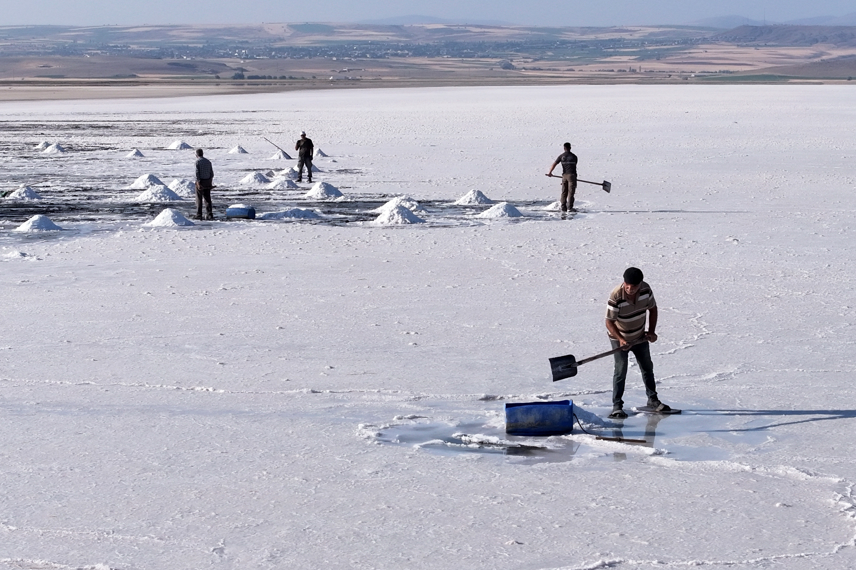 63-year-old Ilhan Gokkurt harvests salt at Palas Tuzla Lake in the Palas neighborhood of Sarioglan, Kayseri, Turkiye on August 08, 2025. Gokkurt provides for his family by harvesting salt from Palas Tuzla Lake, using centuries-old techniques passed down through generations. Located in the Palas Plain, the salt lake was designated a "strictly protected sensitive area" by a 2020 presidential decree, allowing extraction only through traditional methods. As the salt harvesting season begins, Gokkurt sets out at dawn with his horse, named 'Huri'. Wearing wide wooden boards known as “helik” to avoid sinking into the lakebed, he collects the salt by hand, filling plastic containers and dragging them to shore. After bagging the salt, he loads it onto his horse cart and returns home. The harvested salt is then sold to locals in the surrounding area, helping sustain both a tradition and his family's livelihood. (Photo by Sercan Kucuksahin/Anadolu via Getty Images)