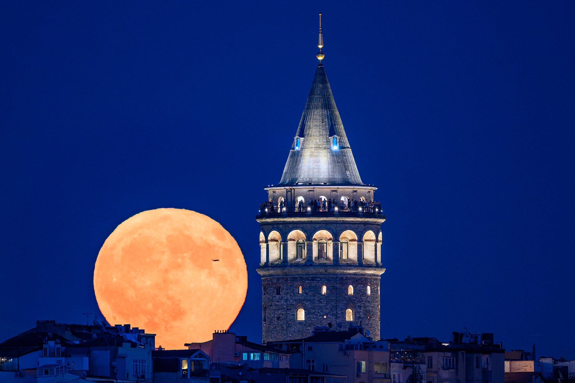 The Sturgeon moon is seen rising over Galata Tower in Istanbul, on August 9, 2025. (Photo by Yasin Akgul/AFP Photo)