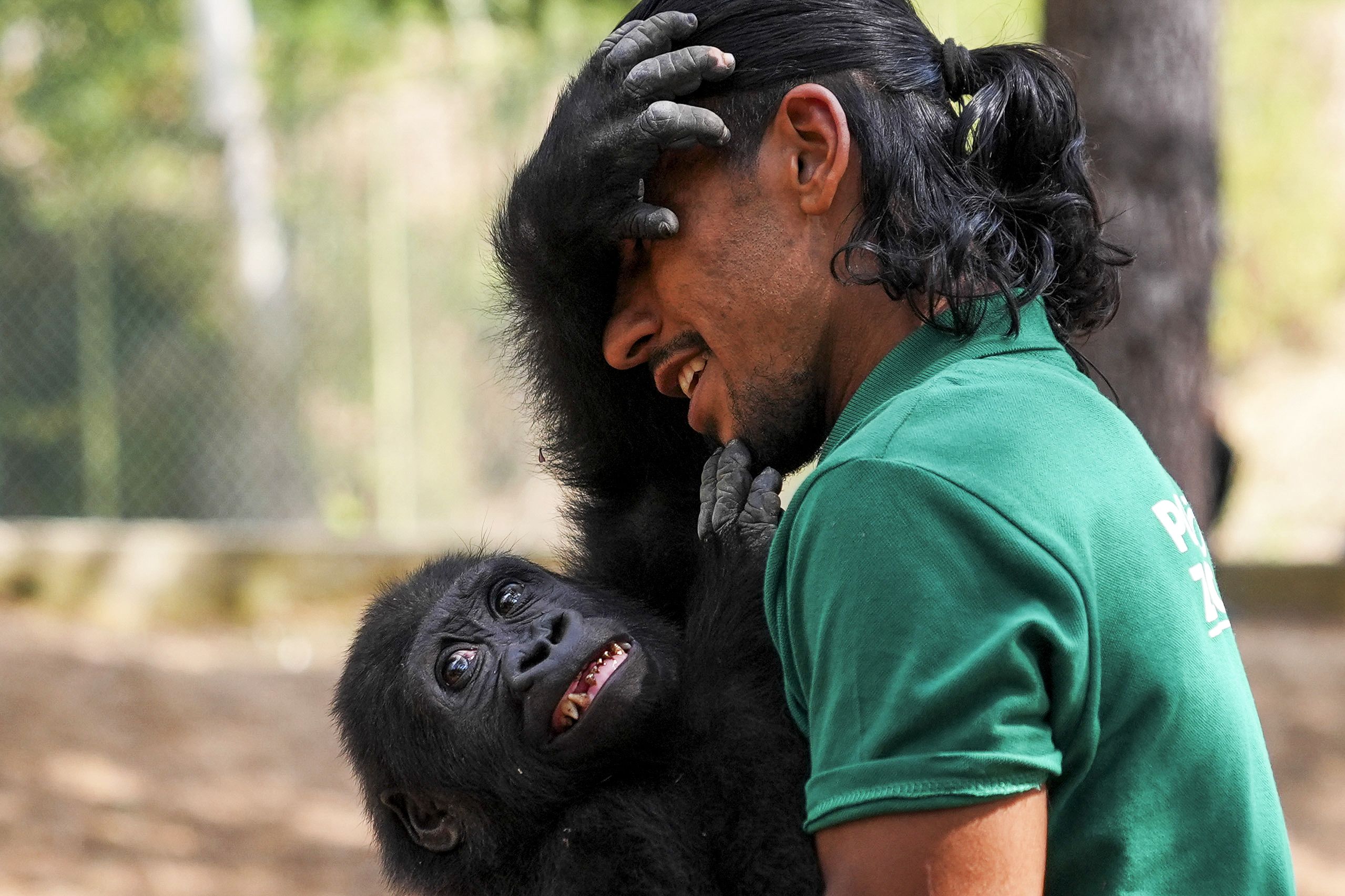 The baby gorilla named 'Zeytin', found last year at the Istanbul Airport inside cargo transiting from Nigeria to Thailand and currently undergoing rehabilitation, plays at a field as it is being prepared by the Ministry of Agriculture and Forestry's Directorate General of Nature Conservation and National Parks (DKMP) to return to its natural habitat in Nigeria, at a zoo in Polonezkoy district of Istanbul, Turkiye on August 20, 2025. On Dec. 22 last year, customs enforcement teams at the Istanbul Airport discovered the baby gorilla in a cage-type box on a Nigeria-origin, Bangkok-bound flight. The rehabilitation process of the gorilla continues at a zoo in Polonezkoy. (Photo by Arife Karakum/Anadolu via Getty Images)