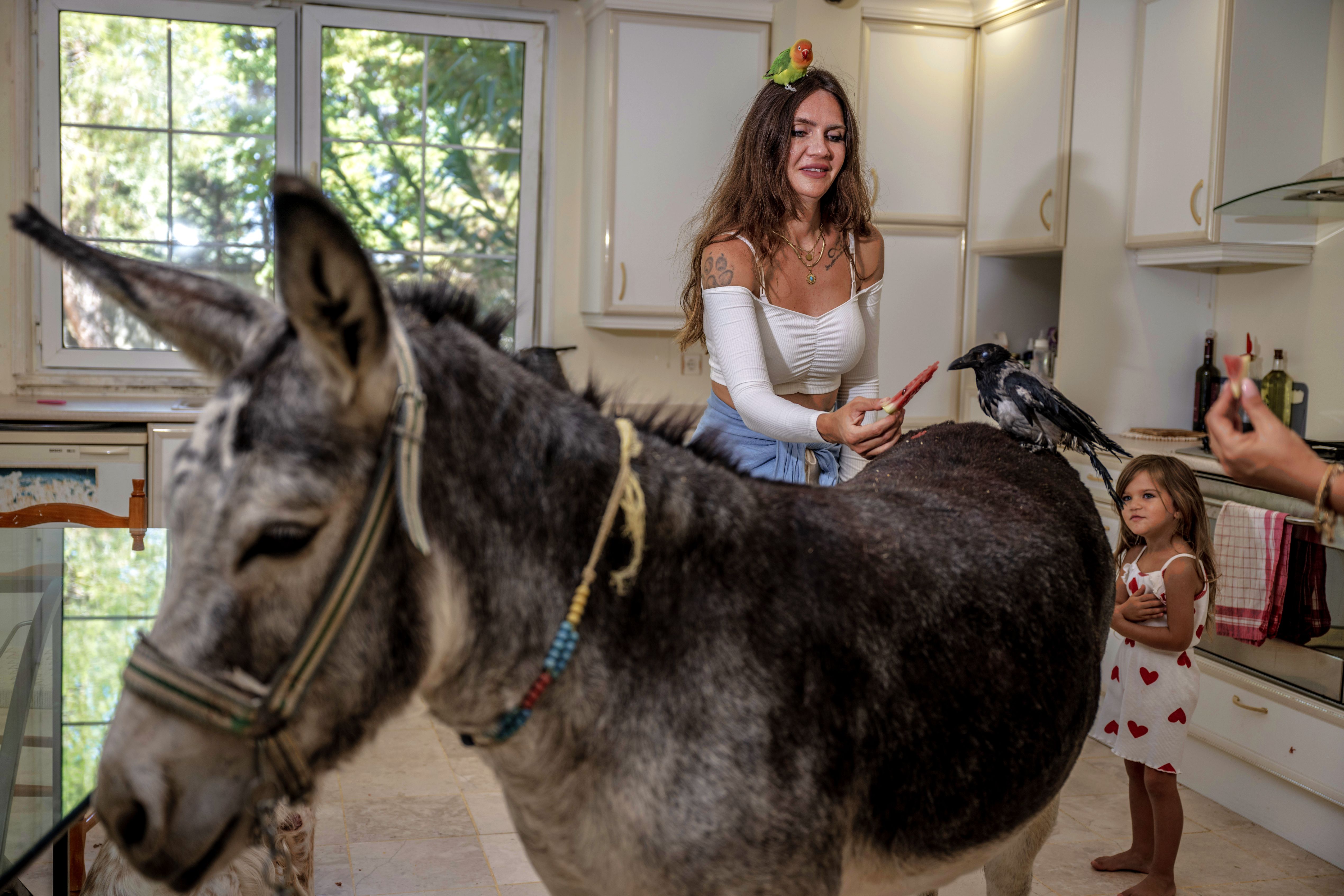 Gizem Apak (C) is seen with her daughter Pera Apak (R) as they feed their adopted donkey named Turkan, while their adopted crow named Gakguk sits on the donkey's back, at their home in Silivri district of Istanbul, Turkiye, on August 26, 2025. The Apak family, who began adopting animals in need about six years ago, now live with donkeys, cows, crows, parrots, rabbits, turtles, roosters, and dozens of dogs, sharing their pool, pond, and garden with them in a life intertwined with nature. (Photo by Sebnem Coskun/Anadolu via Getty Images)