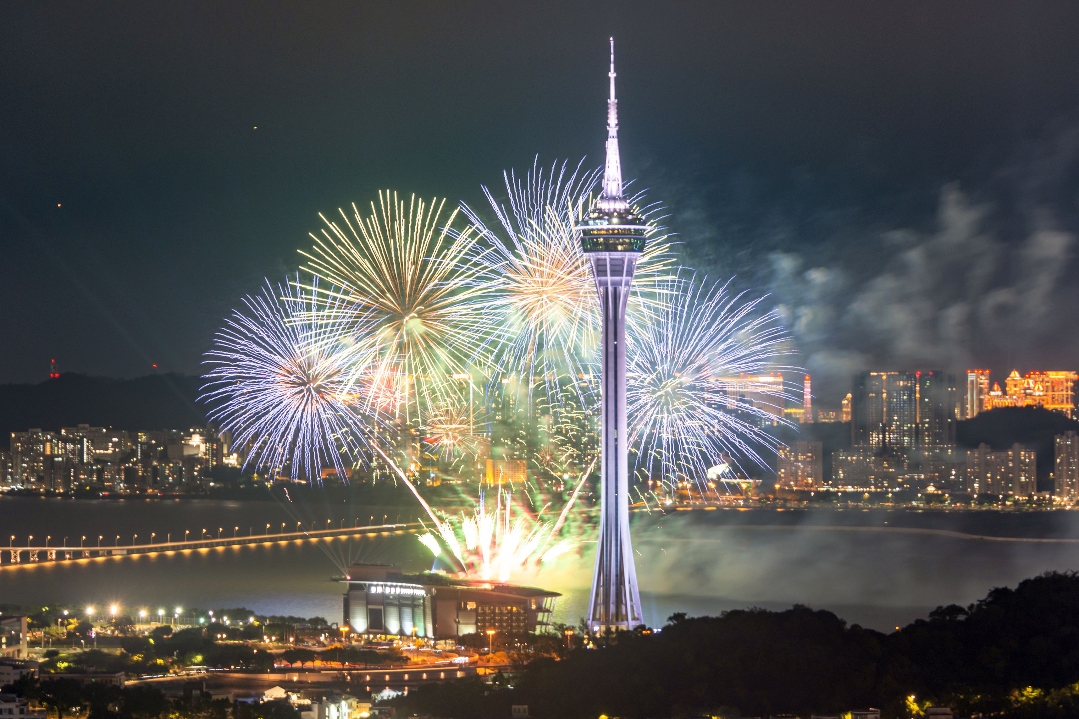 Splendid fireworks light up the night sky on September 6, 2025 in Macao, China. The 33rd Macao International Fireworks Display Contest, organized by the Macao Special Administrative Region (SAR) government tourism office (MGTO), got underway on Saturday night, drawing large crowds of residents and tourists. (Photo by Deng Guohui/VCG via Getty Images)