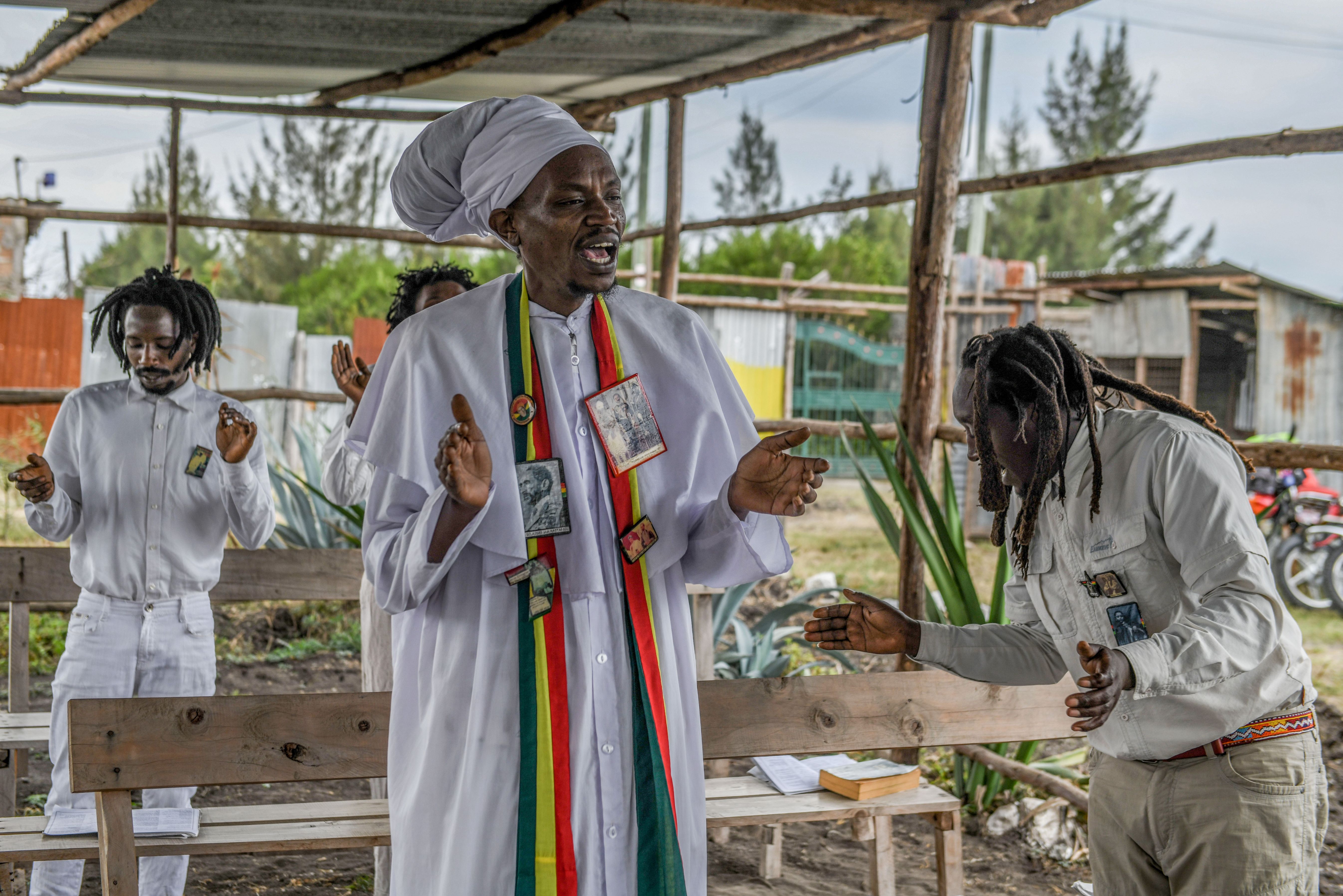 Members of the Rastafarian community, affiliated with the Ethiopia Africa Black International Congress Liberation Church, hold a spiritual prayer ceremony in Nairobi, Kenya, on August 24, 2025. The community demonstrated their efforts to preserve Pan-African identity and cultural values within urban life. (Photo by Gerald Anderson/Anadolu via Getty Images)