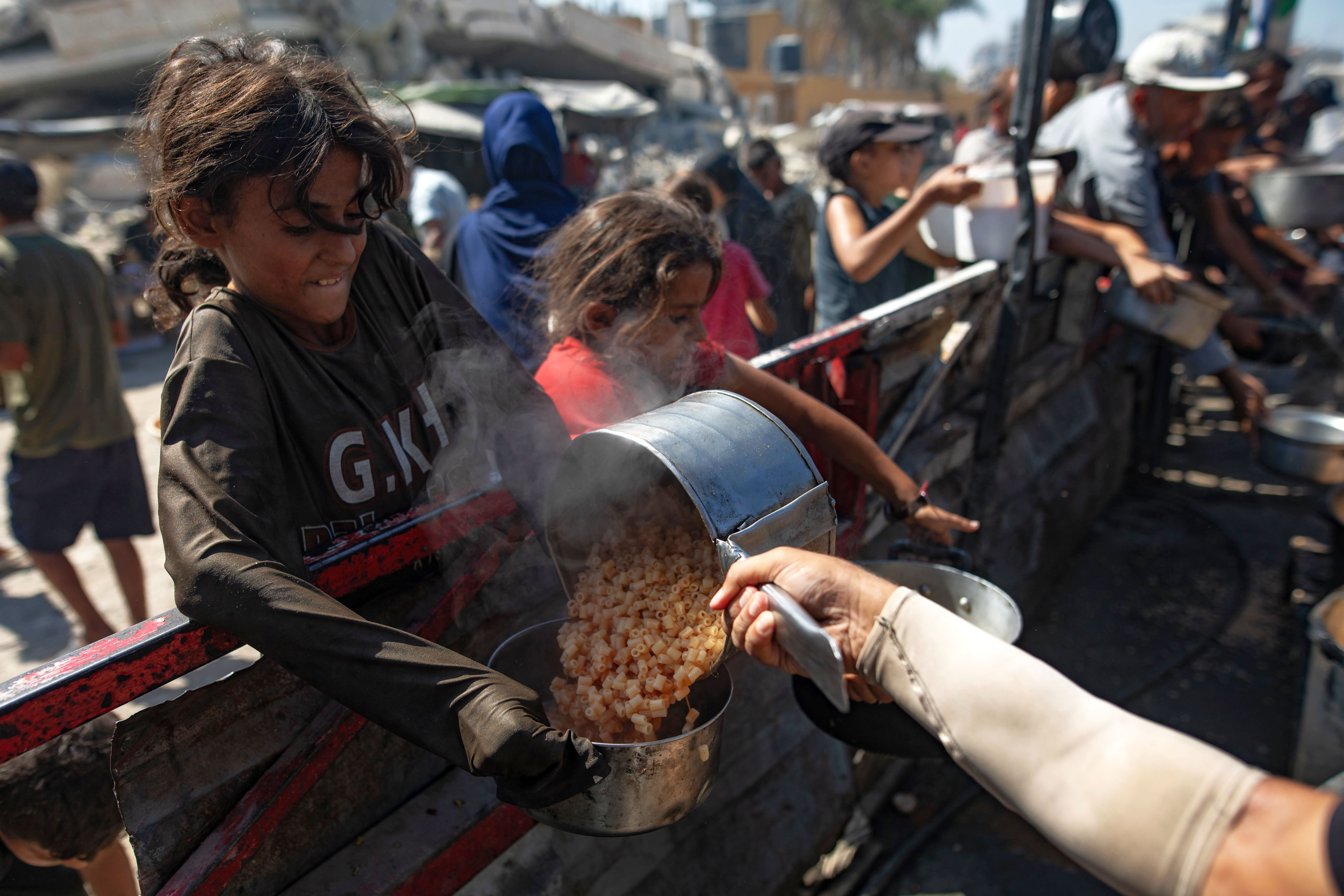 Palestinians, including children, hold pots as they queue to receive food from a kitchen that provides free food for displaced people in Gaza City, northern Gaza Strip, 12 September 2025. According to the UN, around 90 percent of the population, or 1.9 million people, in Gaza have been displaced since the start of the conflict. (Photo by Haitham Imad/EPA)