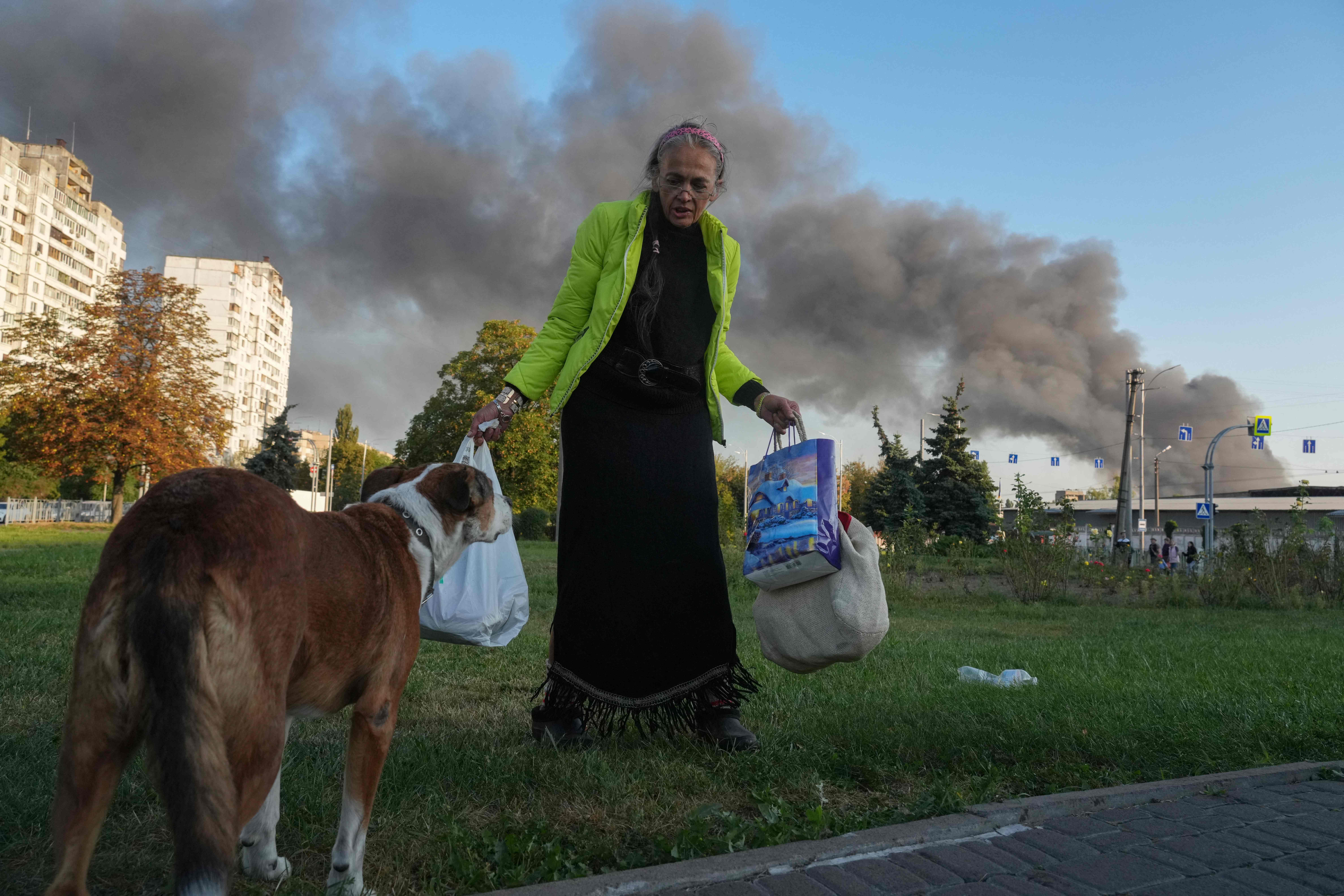 A woman speaks to a dog near the roadside as smoke rises in the background following a Russian drone and missile strike in Kyiv on September 7, 2025, amid the Russian invasion of Ukraine. The roof and upper floors of the government headquarters in Kyiv, the Ukrainian capital, were damaged in a Russian strike early on September 7, 2025, Ukraine's Prime Minister said. “The roof and upper floors were damaged as a result of an enemy attack. Rescuers are currently extinguishing the fire”, she wrote on Telegram. (Photo by Oleksii Filippov/AFP Photo)