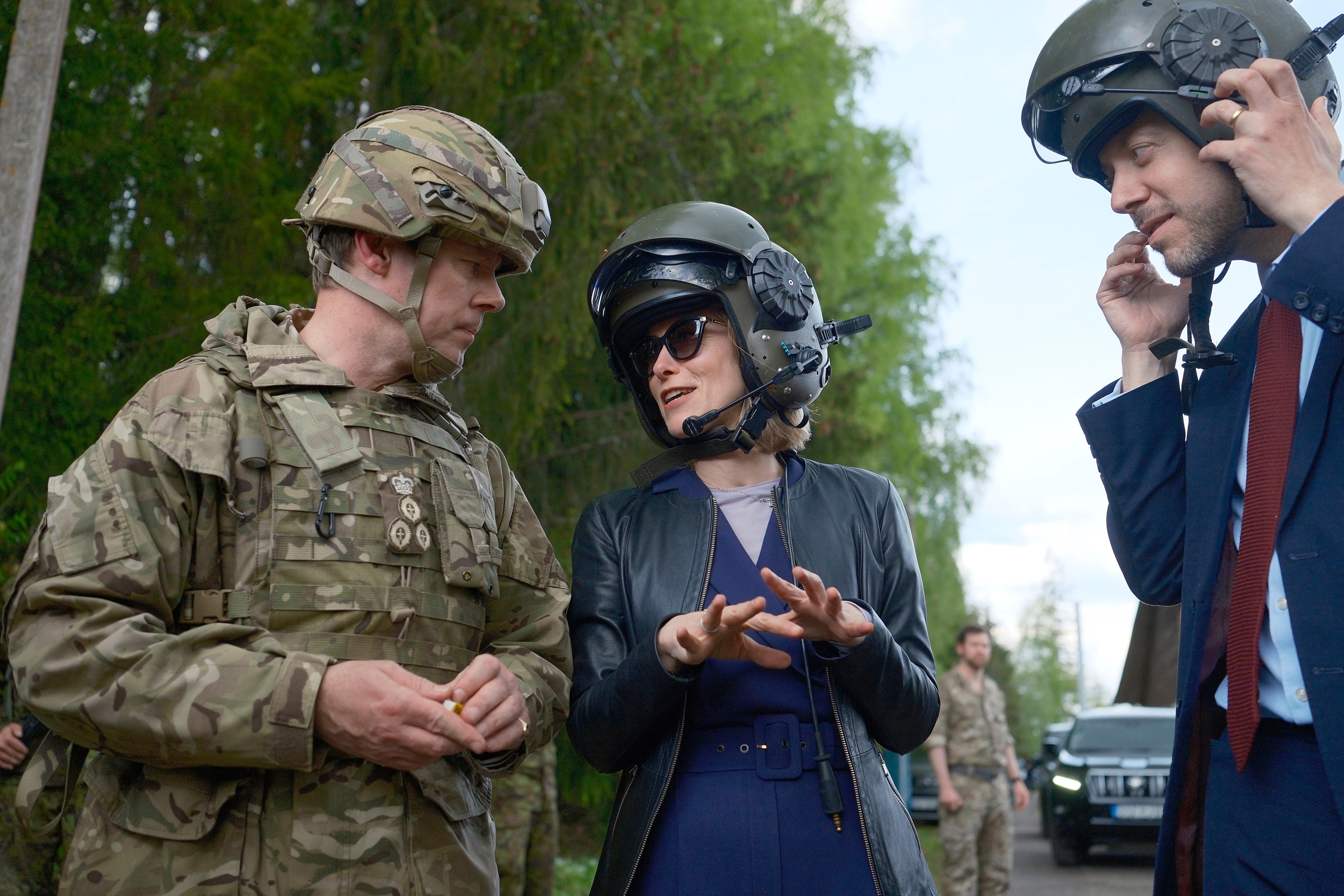 Estonian Prime Minister Kaja Kallas, center, speaks to Brig. Giles Harris, commander of British forces in Estonia, left, and Ross Allen, British ambassador to Estonia, at an undisclosed location in Estonia on Wednesday, May 15, 2024. Kallas was visiting the country's largest defense exercises. (Photo by Hendrik Osula/AP Photo)