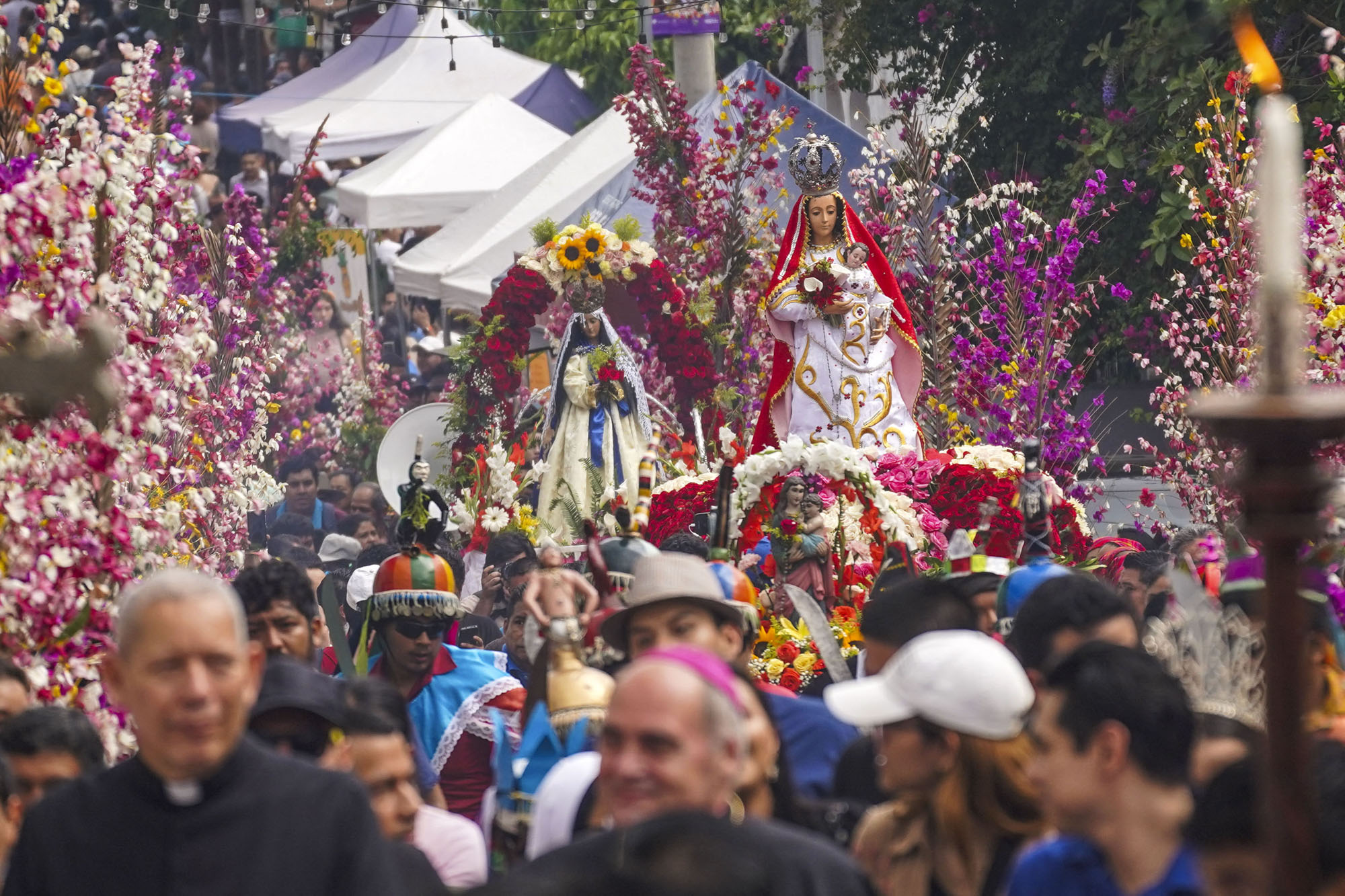 Faithful carry statues of the Virgin Mary during the 42nd edition of the Flowers and Palm Festival in Panchimalco, 20 km south of San Salvador, on May 5, 2024. (Photo by Camilo Freedman/AFP Photo)