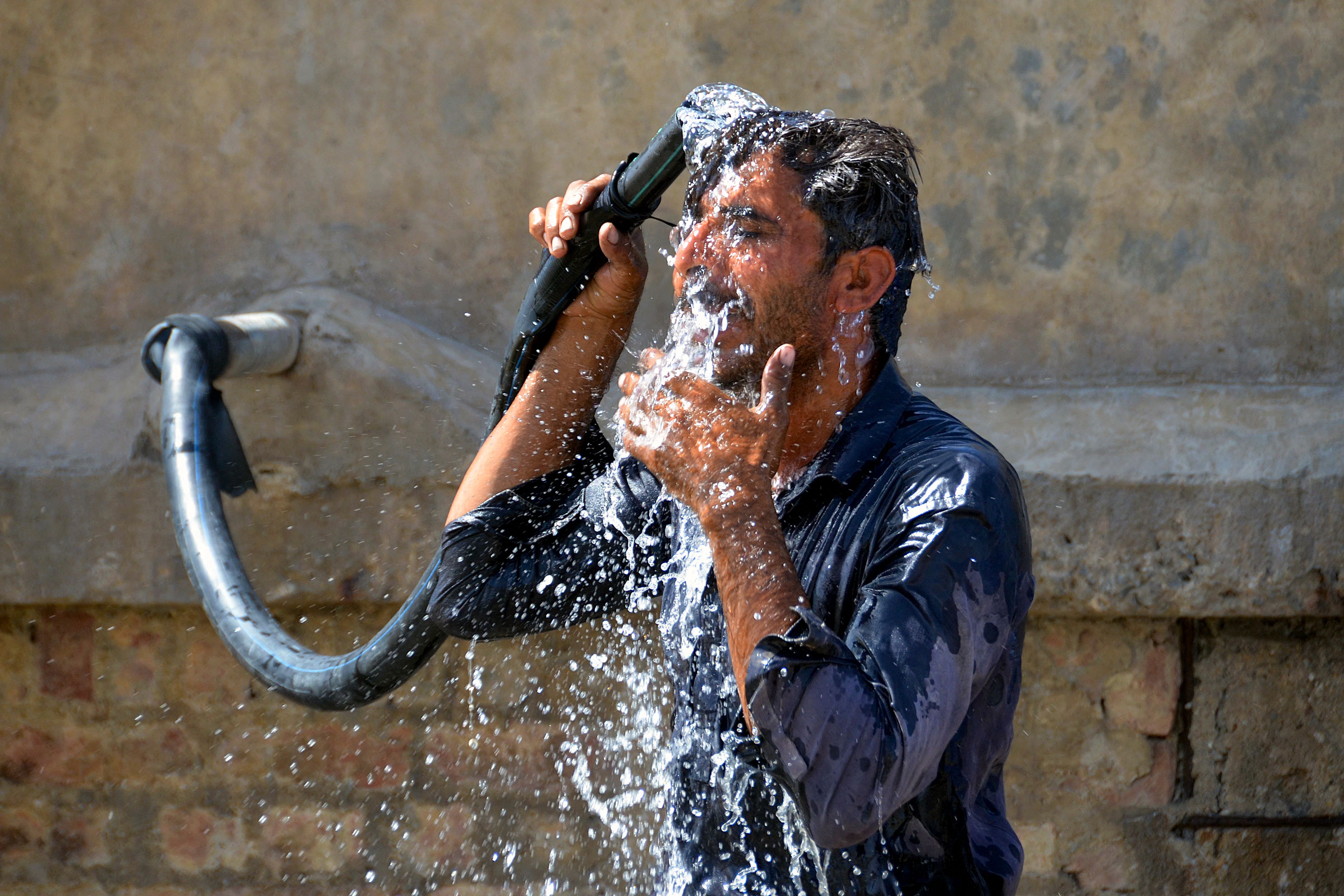 A man bathes with water from a pipe on a hot summer day in Jaffarabad, in Pakistan's Balochistan province on May 30, 2024, amid the ongoing heatwave. Pakistan's meteorological office has forecast three heatwaves – one already underway and two more set to hit in early and late June. (Photo by Fida Hussain/AFP Photo)