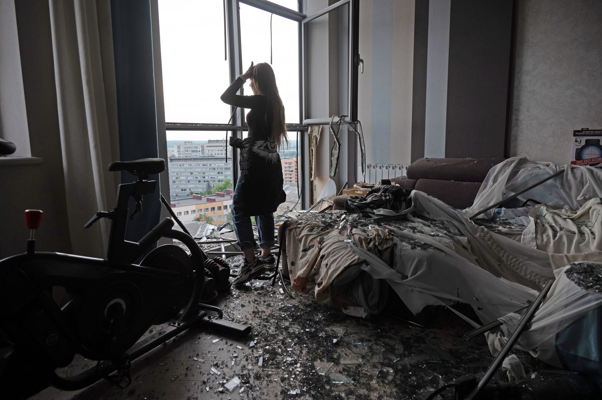 An interior view of a destroyed building on a residential area following Russian missile attack on May 14, 2024. In Kharkiv this afternoon, three separate attacks occurred, damaging buildings in the city center and near the Peremoha metro station. Over 10 people were injured, with one in severe condition. Following the Russian attacks, emergency response teams swiftly mobilized to the affected areas to provide medical assistance to the injured and secure the sites. Authorities are investigating the incidents as tensions rise in the region. (Photo by Stringer/Anadolu via Getty Images)