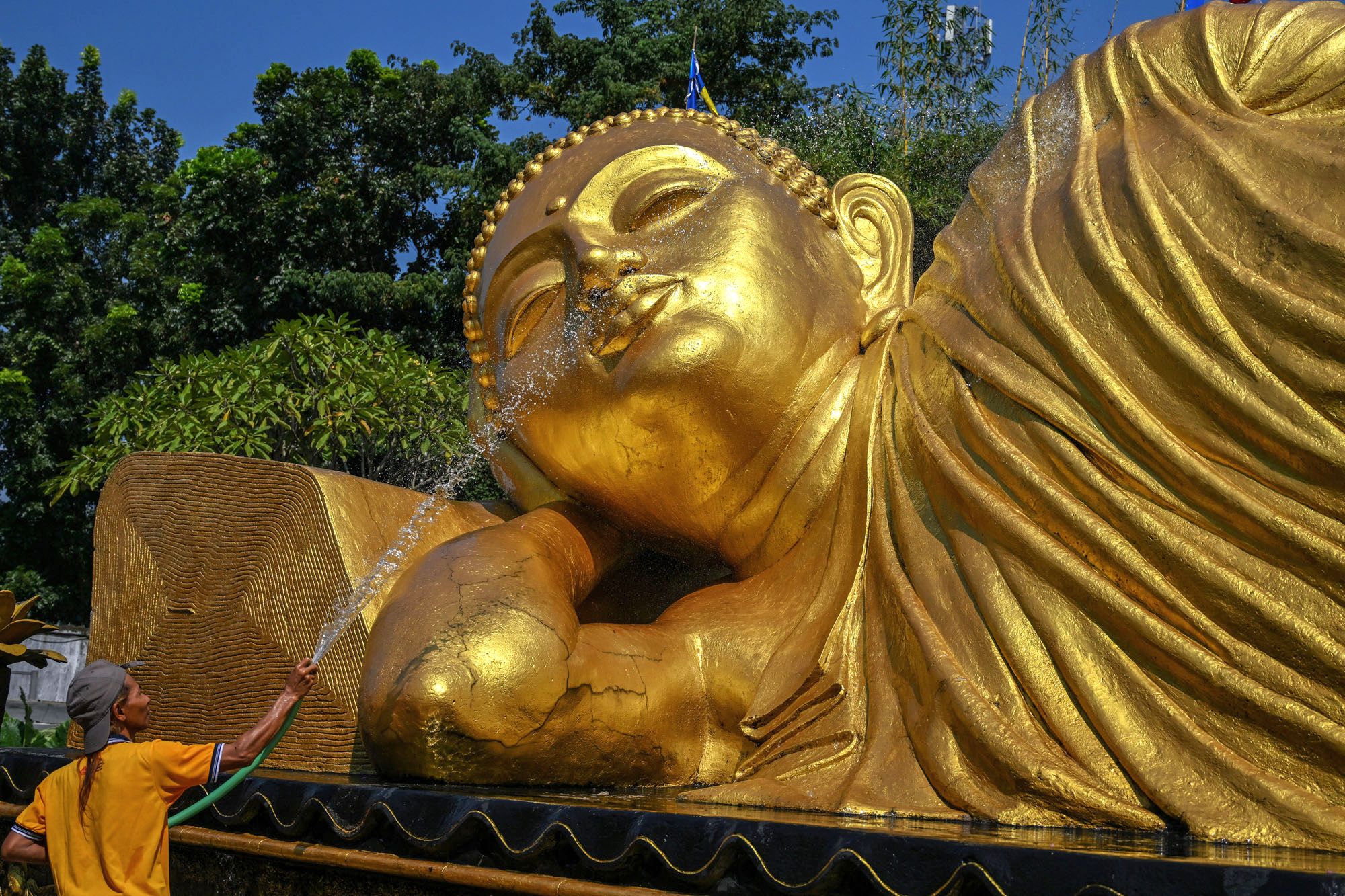 Workers clean a Buddha statue at the Maha Vihara Mojopahit temple in Mojokerto, Indonesia on May 15, 2024 ahead of the Vesak festival which commemorates the birth, enlightenment and death of Buddha. (Photo by Juni Kriswanto/AFP Photo)