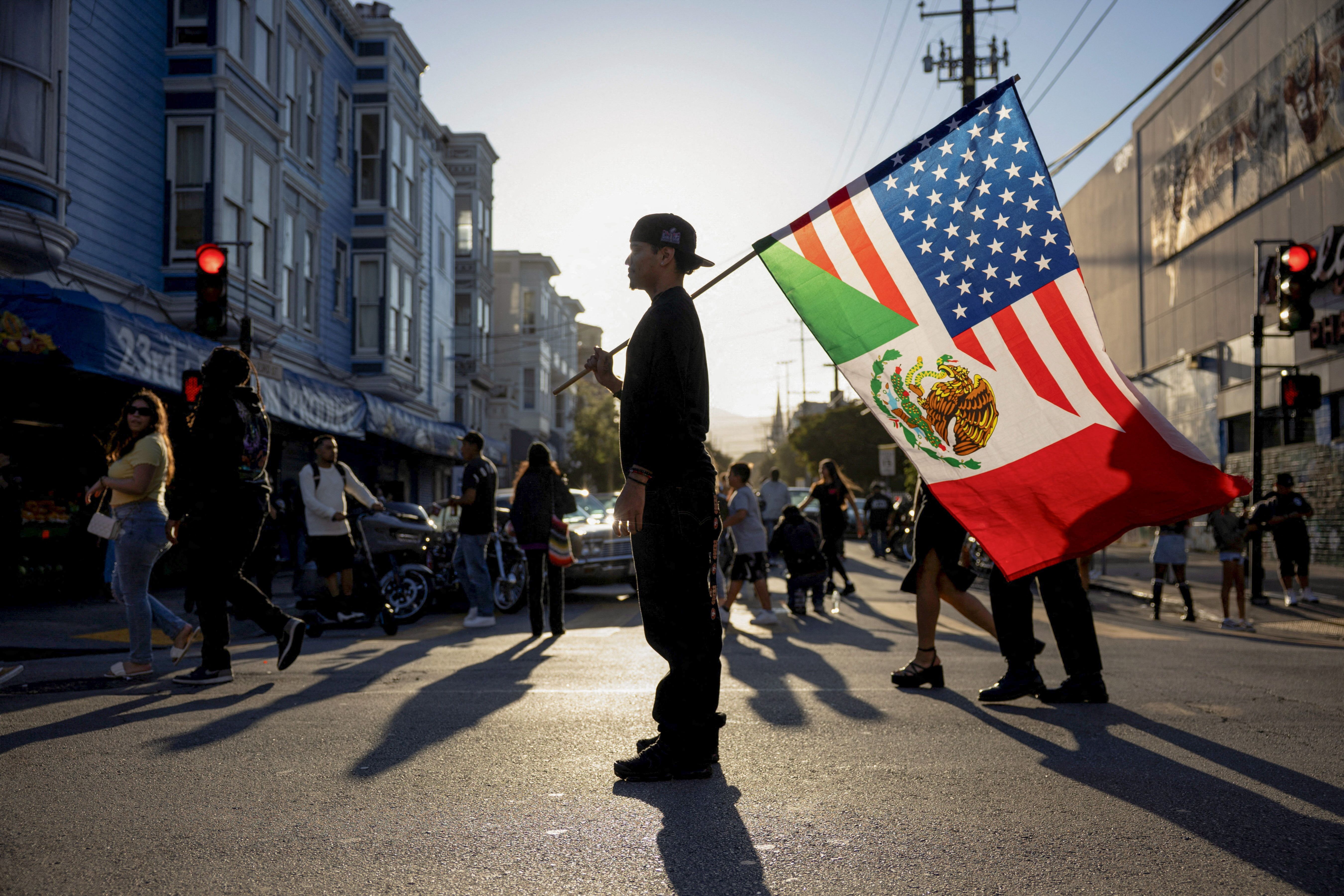 Jean Carlo Bonilla holds a flag combining the flags of Mexico and the U.S. at a lowrider car show celebrating lowriding culture and supporting immigration, in San Francisco, California, U.S., September 20, 2025. (Photo by Manuel Orbegozo/Reuters)