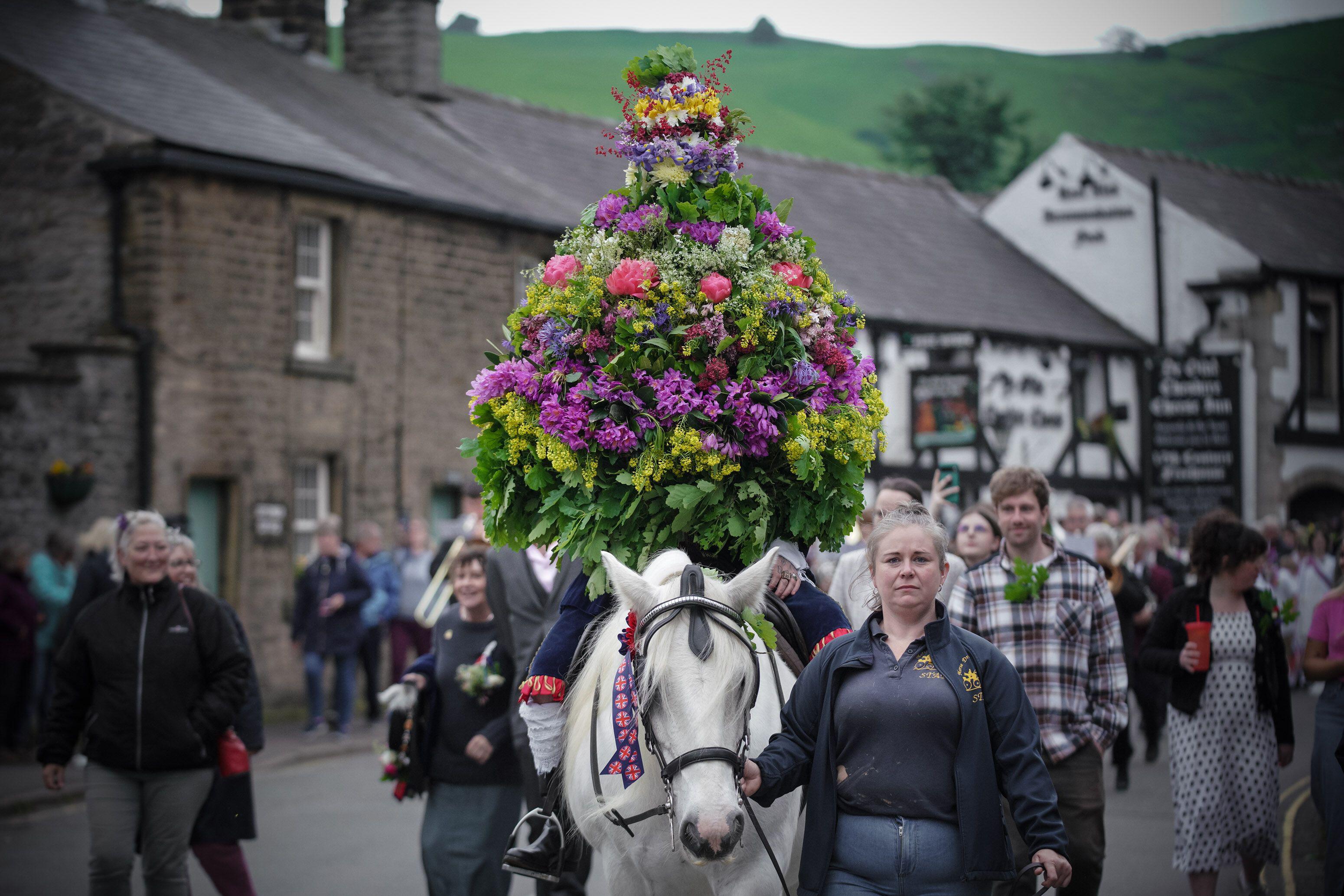 Garland Day Celebration In Castleton, Derbyshire on May 29, 2024 sees a framework of cut flowers prepared by local villagers placed on the head of the King (John Turner) then paraded around the town on horseback dressed in Stuart costume. Garland day dates back to the 1700Os and though its true origins are not fully understood it is believed to be an ancient fertility rite with Celtic connections. (Photo by Guy Corbishley/Alamy Live News)