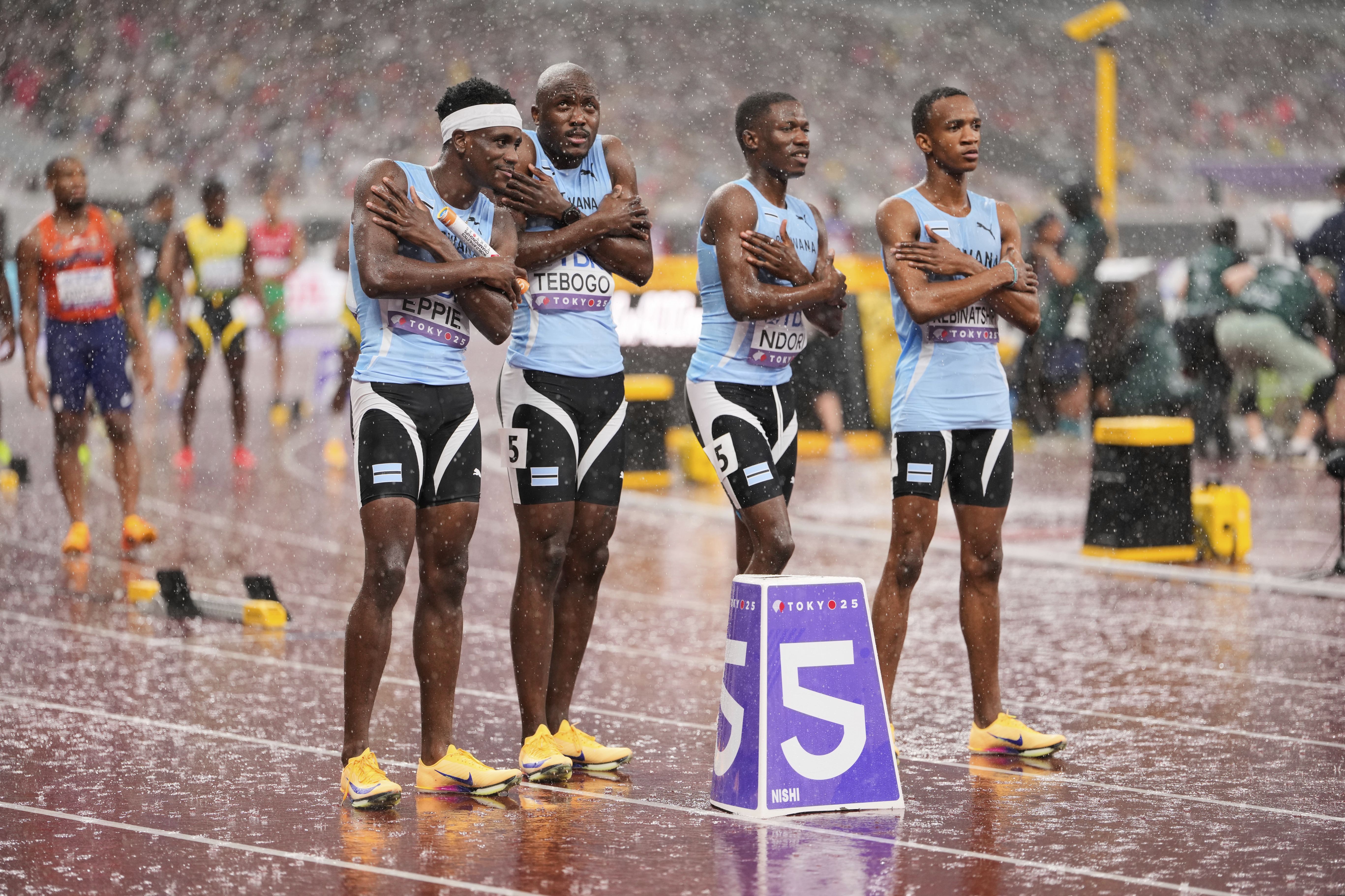 Team Botswana reacts to the cold rain before the start of the men's 4 X 400 meters relay at the World Athletics Championships in Tokyo, Sunday, September 21, 2025. (Photo by Eugene Hoshiko/AP Photo)