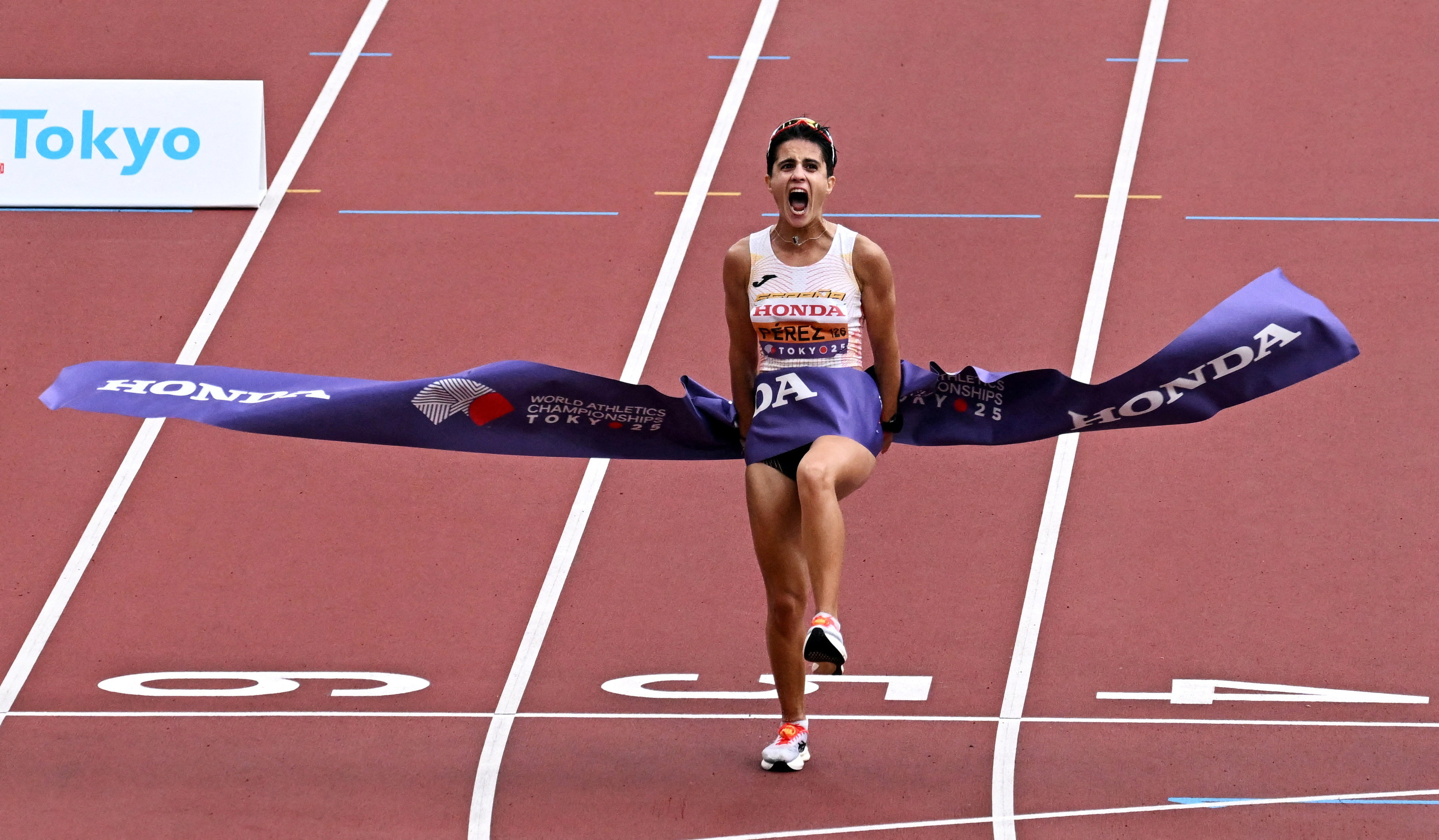 Gold medalist Maria Perez of Team Spain reacts after winning the Women's 20 Kilometres Race Walk during day eight of the World Athletics Championships Tokyo 2025 at National Stadium on September 20, 2025 in Tokyo, Japan. (Photo by Dylan Martinez/Reuters)