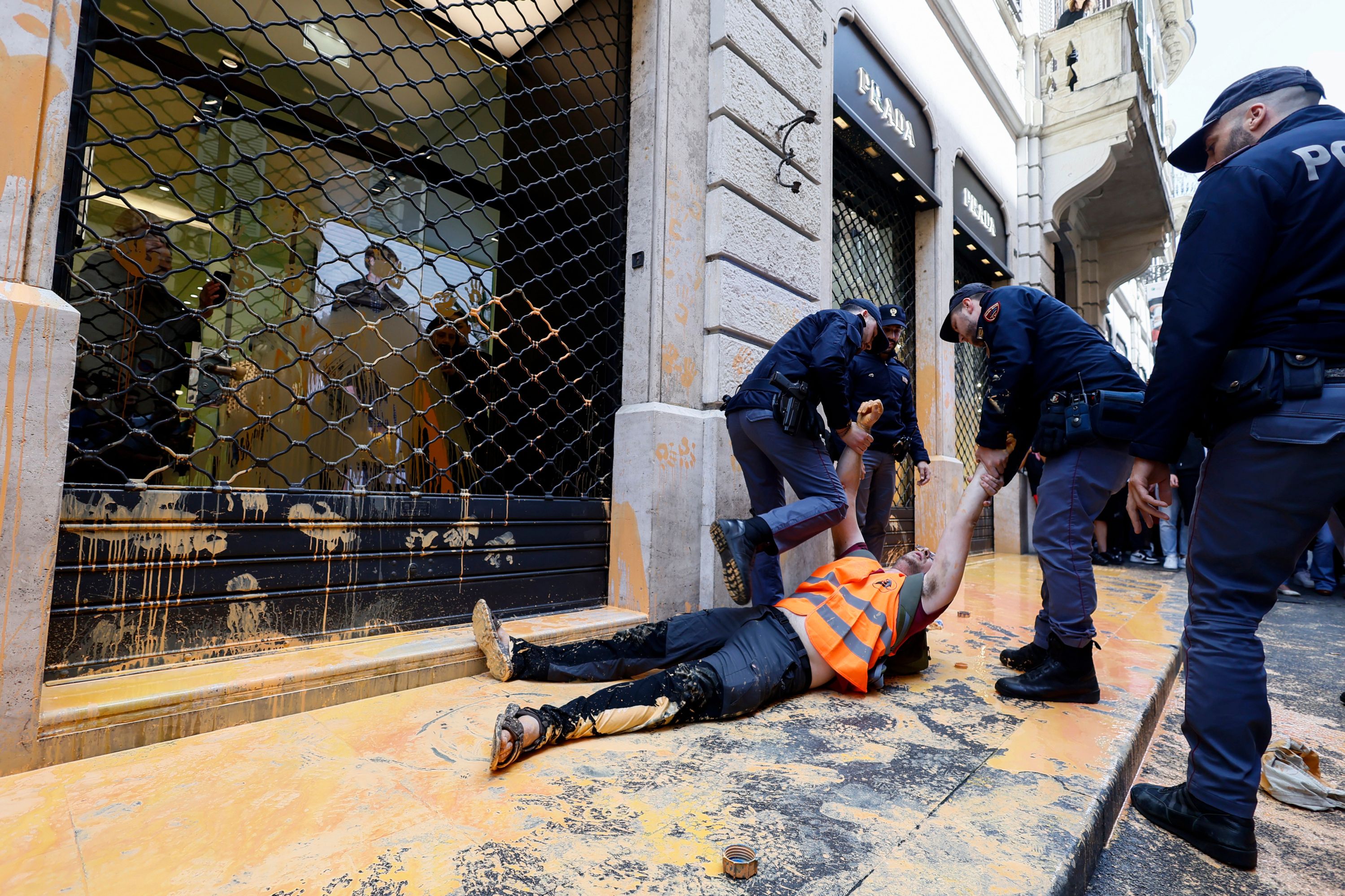 A Last Generation climate activist is dragged away by police officers after throwing washable paint on a Prada shop window in the city’s fashionable Via Condotti in Rome, Italy on May 16, 2024. (Photo by Cecilia Fabiano/AP Photo)