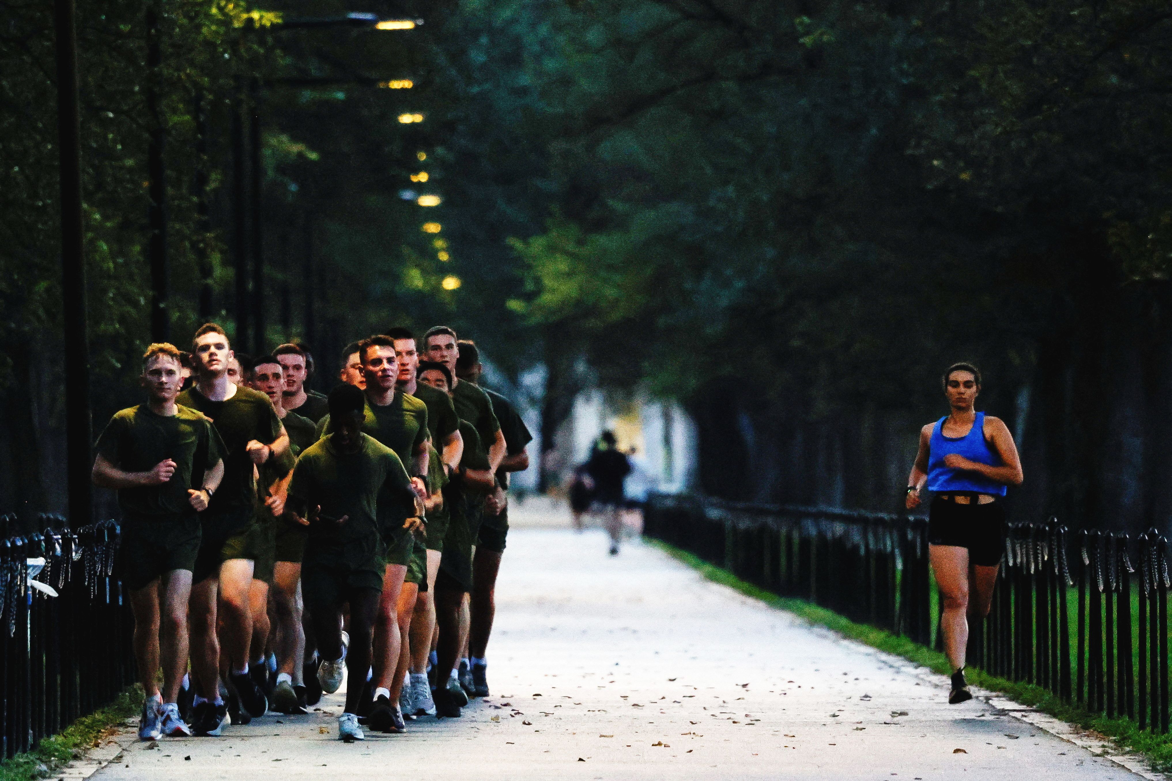 U.S. Marines run alongside a jogger during a morning training session in Washington on September 23, 2025. (Photo by Daniel Becerril/Reuters)