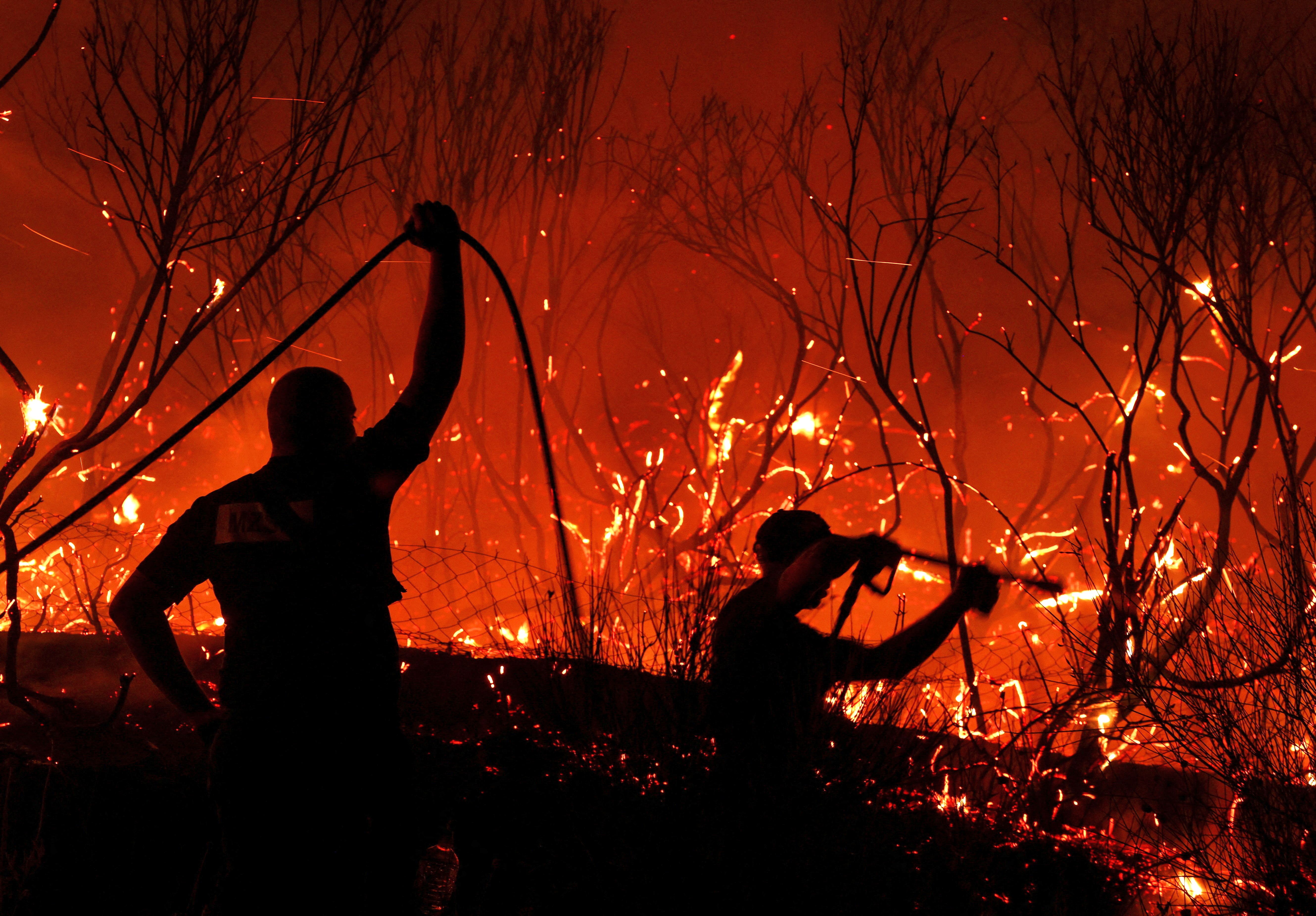 Firefighters try to extinguish a fire, as wildfire continues to burn in Delvina, Albania, on August 12, 2025. (Photo by Florion Goga/Reuters)