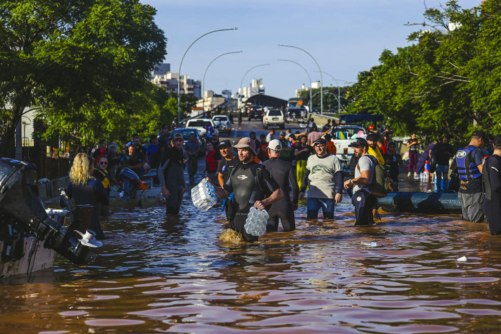 This handout photo released by the Porto Alegre City Hall (PMPA) shows a group of volunteers on a flooded street of Porto Alegre, Rio Grande do Sul State, Brazil, on May 6, 2024. From top to bottom, rescuers scour buildings in Porto Alegre for inhabitants stuck in apartments or on rooftops as unprecedented flooding killed at least 78 people in the southern state, with dozens missing and some 115,000 forced to leave their homes. (Photo by Giulian Serafim/PMPA via AFP Photo)