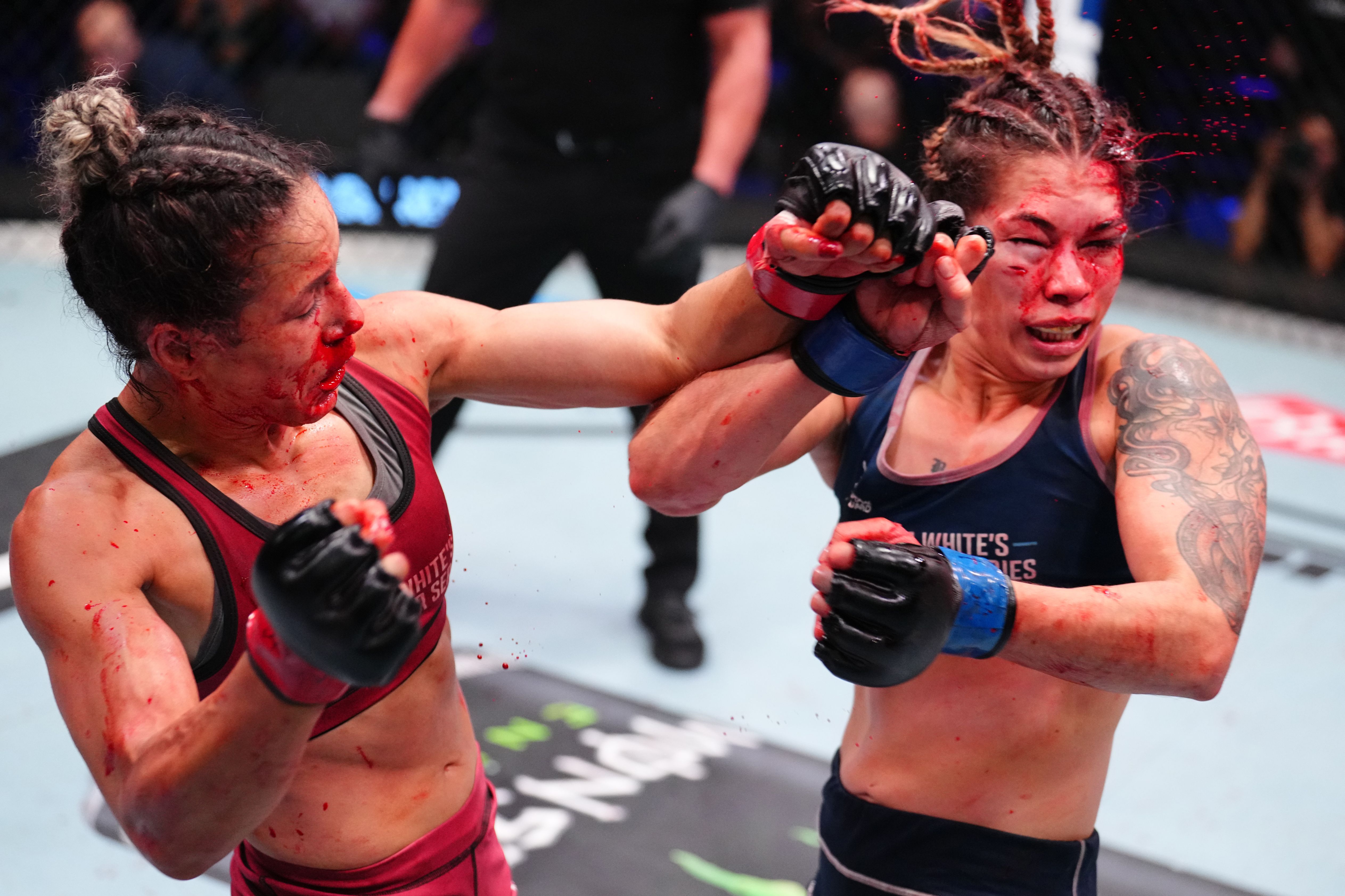 (L-R) Jeisla Chaves of Brazil punches Sofia Montenegro of Argentina in a flyweight fight during Dana White's Contender Series season nine, week seven at UFC APEX on September 23, 2025 in Las Vegas, Nevada. (Photo by Chris Unger/Zuffa LLC)