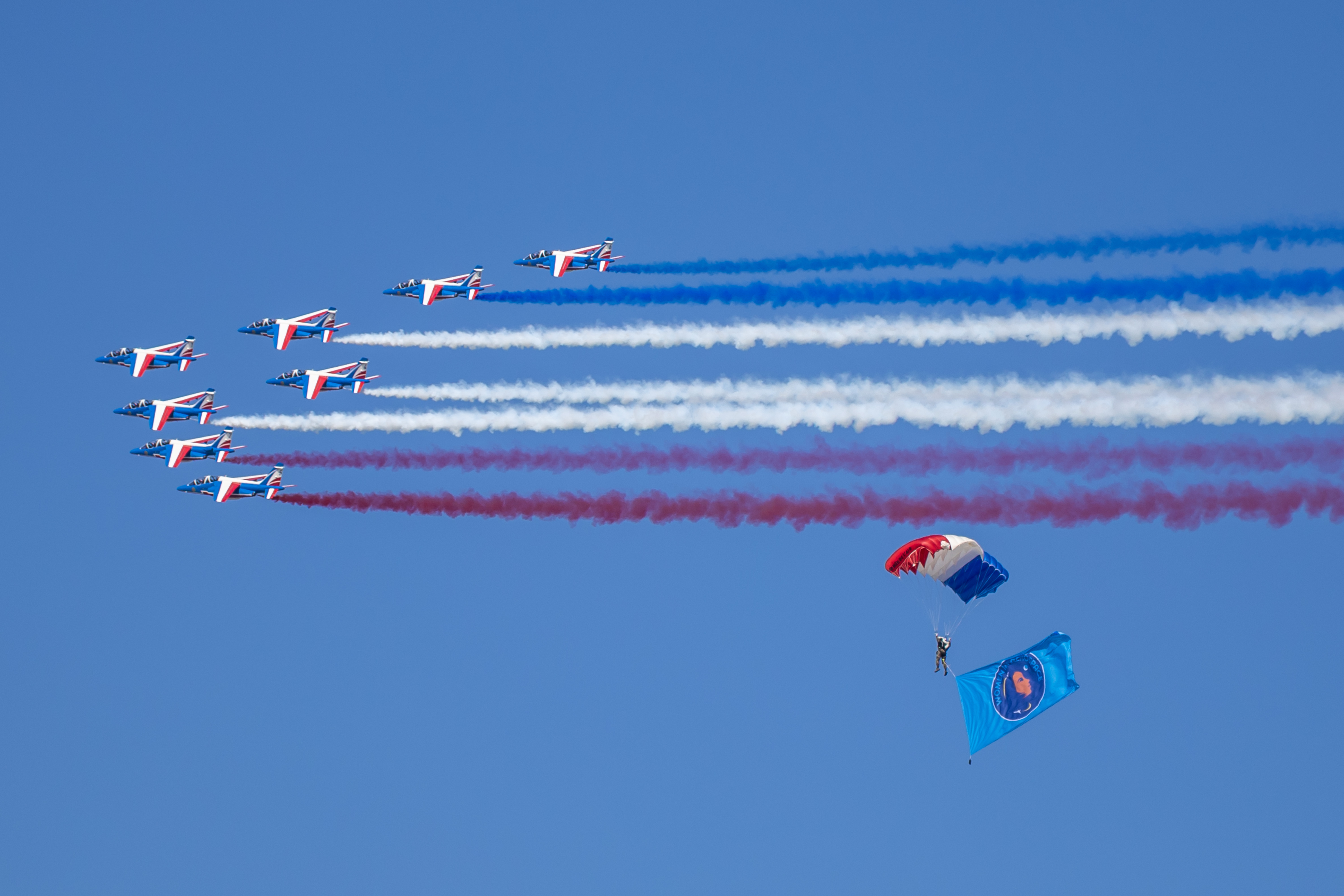 French aerobatic flying team Patrouille de France (PAF) aircraft perform a flyover during the 55th edition of the International Paris Air Show at the Paris-Le Bourget Airport, in Le Bourget, near Paris, France, 16 June 2025. The Paris Air Show, one of the largest trade fairs of the aerospace-industry and air shows in the world, runs from 16 to 22 June. (Photo by Christophe Petit Tesson/EPA)