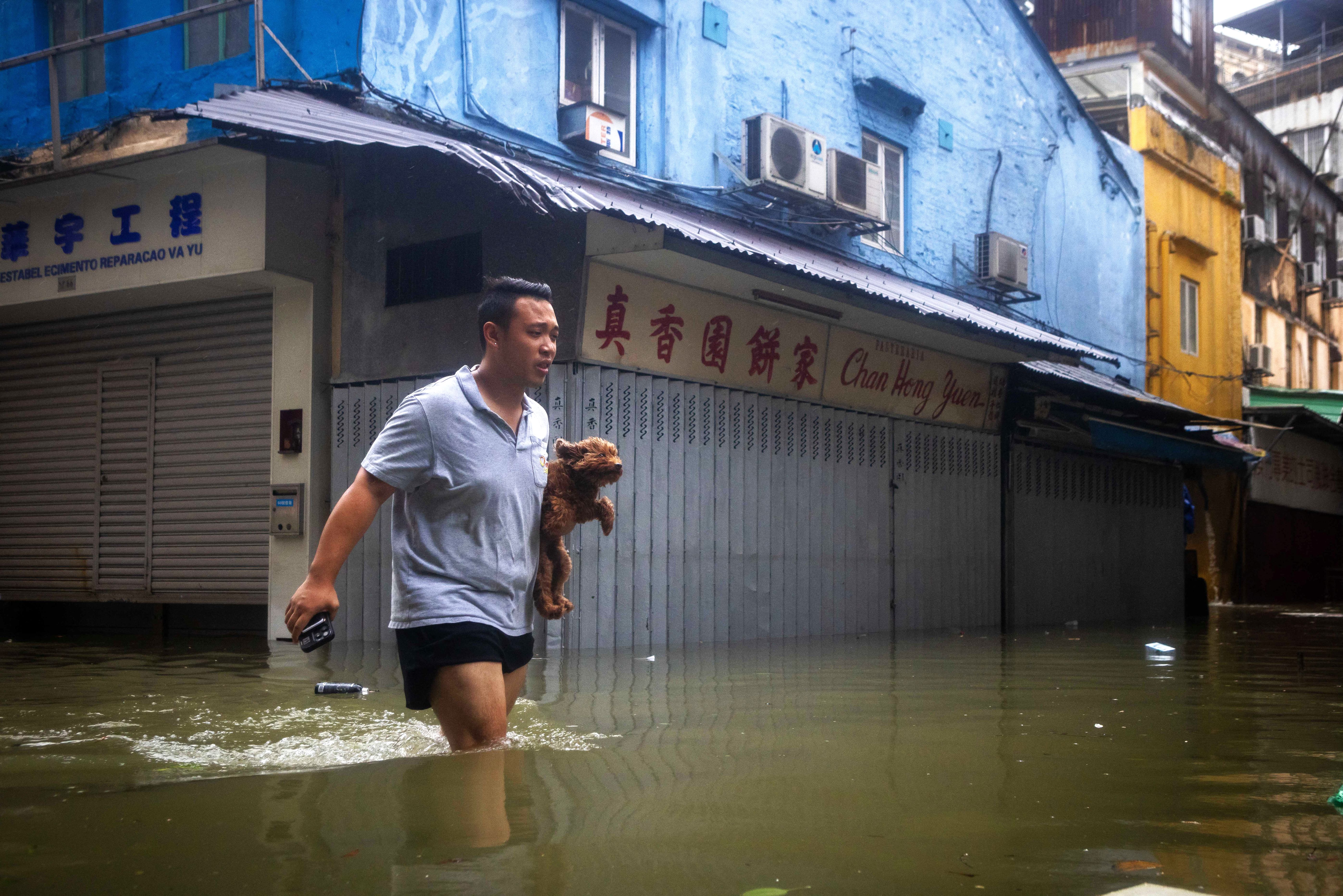 A man holds his dog while walking through a flooded street during the passage of Super Typhoon Ragasa in Macau on September 24, 2025. Fierce winds, pounding rain and high seas battered Hong Kong on September 24 as Super Typhoon Ragasa headed into southern China after causing a lake burst that killed at least 14 people in Taiwan. (Photo by Eduardo Leal/AFP Photo)