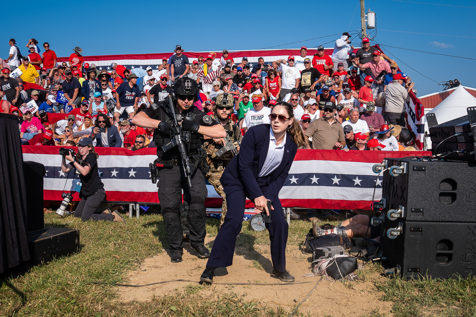 Members of the US secret service scramble toward the stage as Donald Trump fell while speaking as shots rang out during a campaign rally at in Butler, Pennsylvania in 2024. (Photo by Jabin Botsford/Siena awards festival 2025)