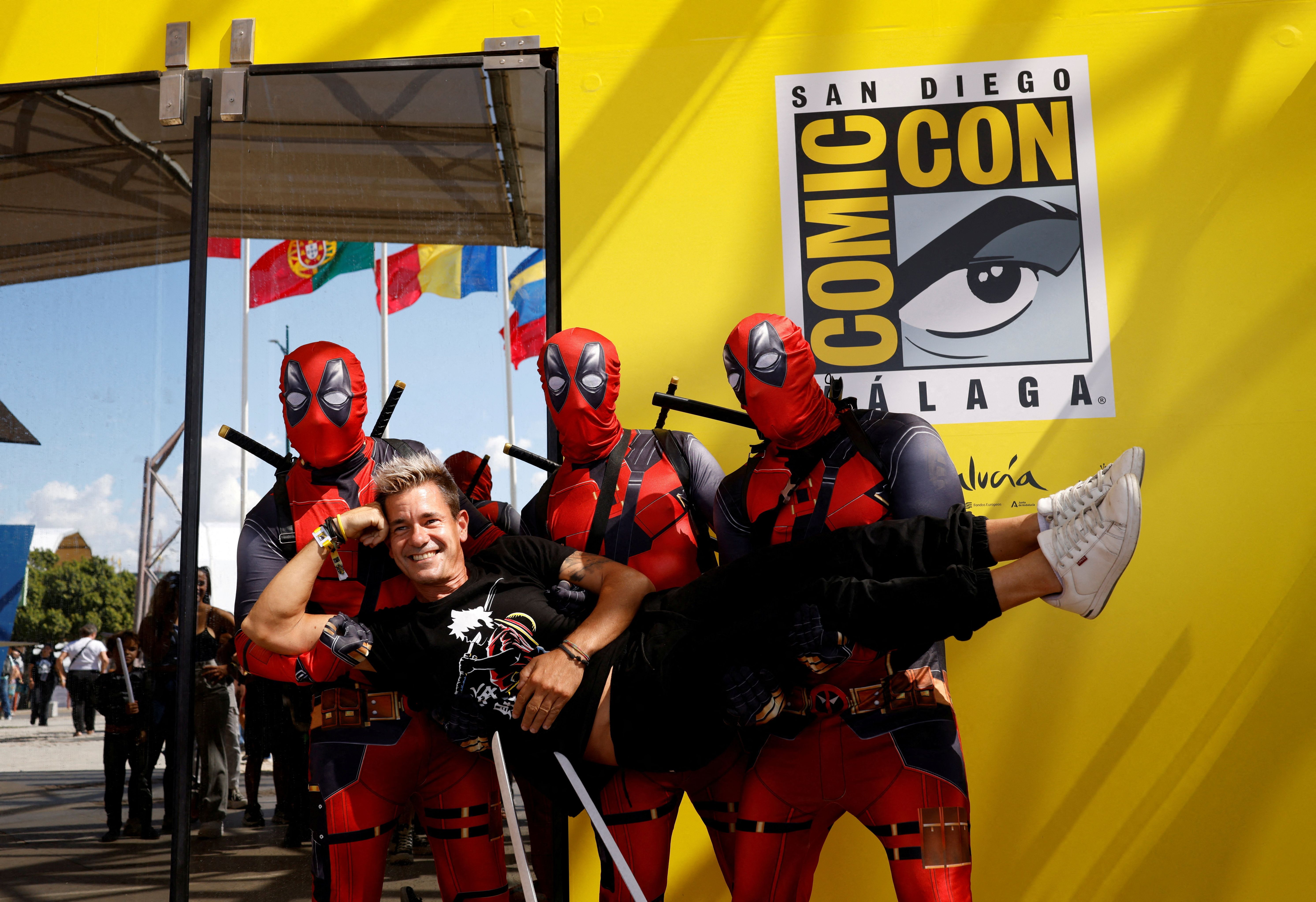 Cosplayers dressed as Deadpool hold a visitor for a picture during the San Diego Comic-Con Malaga, in Malaga, Spain on September 25, 2025. (Photo by Marcelo del Pozo/Reuters)