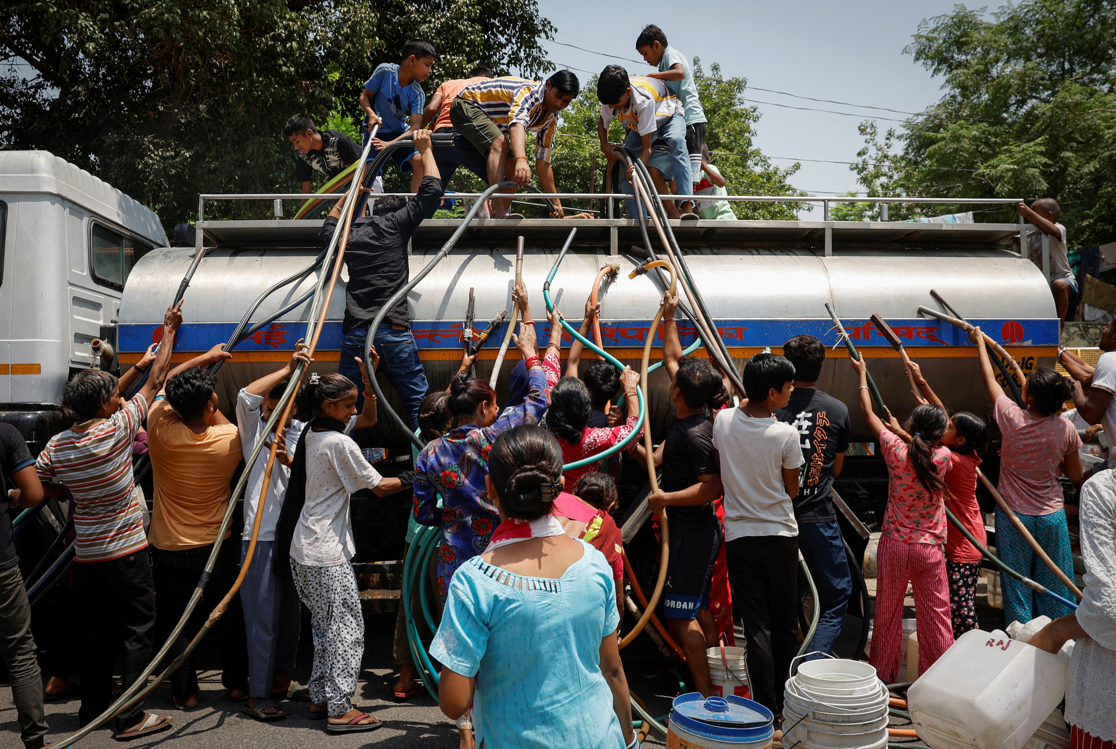 Residents fill their containers with drinking water from a municipal tanker on a hot summer day in New Delhi, India, on May 21, 2024. (Photo by Adnan Abidi/Reuters)