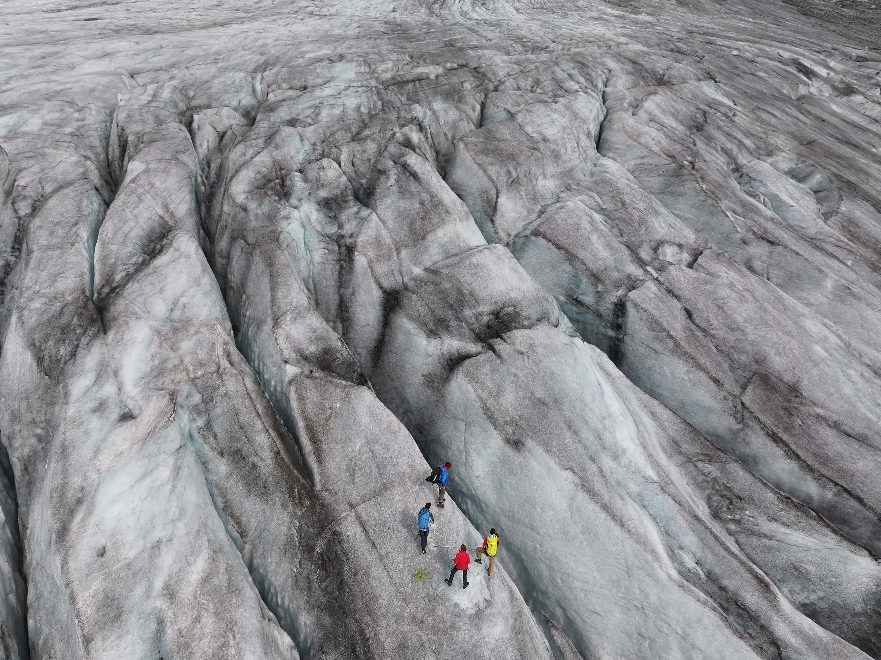 A scientific team from the Swiss Federal Institute of Technology in Zurich stands among crevasses on the Rhône Glacier while collecting data near Gletsch, Switzerland, on Friday, August 22, 2025. The Rhône Glacier, among Switzerland’s largest, is likely facing another withering year following record-breaking temperatures across Europe in June and overall low levels of snowfall. (Photo by Sean Gallup/Getty Images)