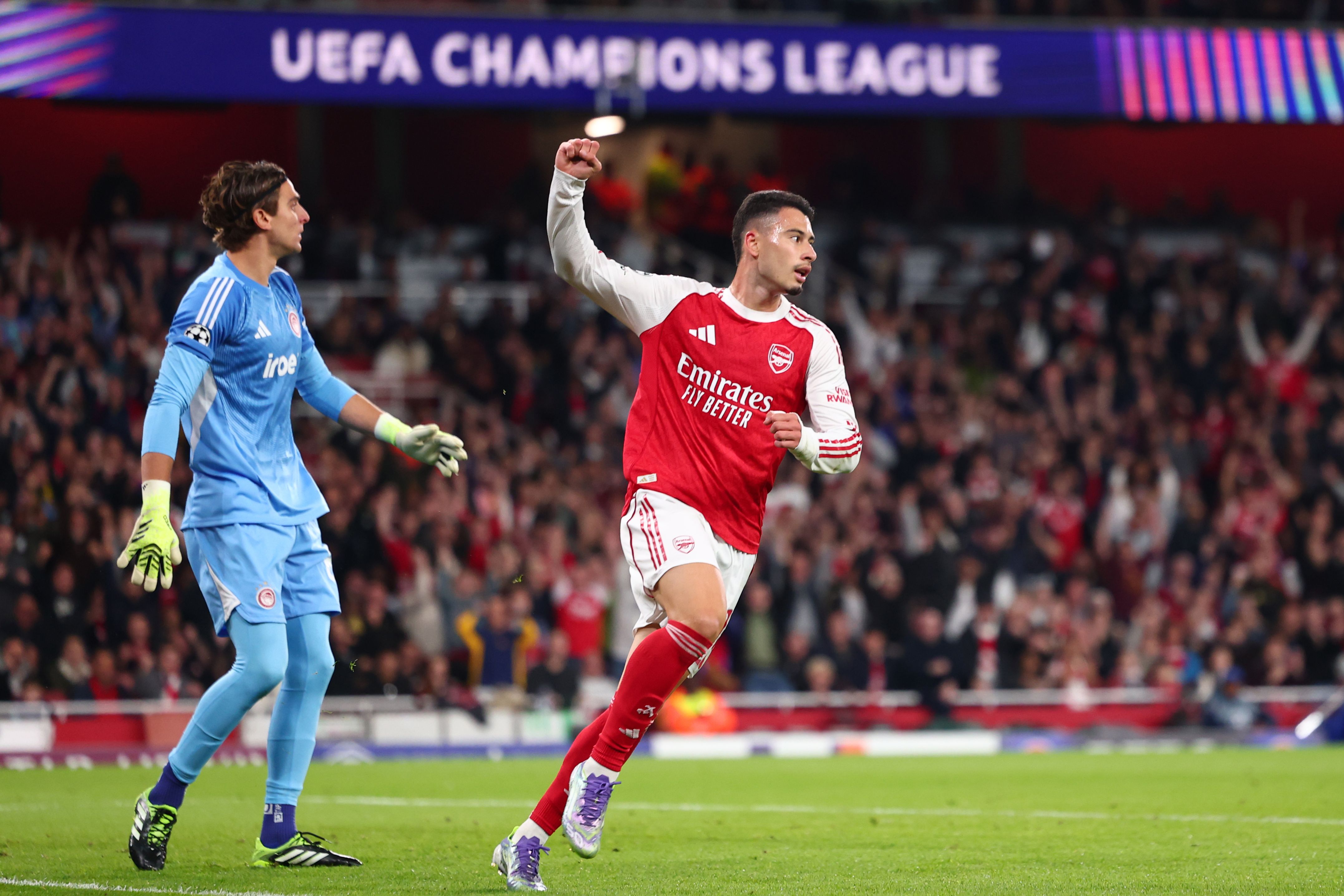 Arsenal's Gabriel Martinelli celebrates scoring the opening goal for 1-0 during the UEFA Champions League 2025/26 League Phase MD2 match between Arsenal FC and Olympiacos FC at Arsenal Stadium on October 1, 2025 in London, England. (Photo by Shaun Brooks – CameraSport via Getty Images)