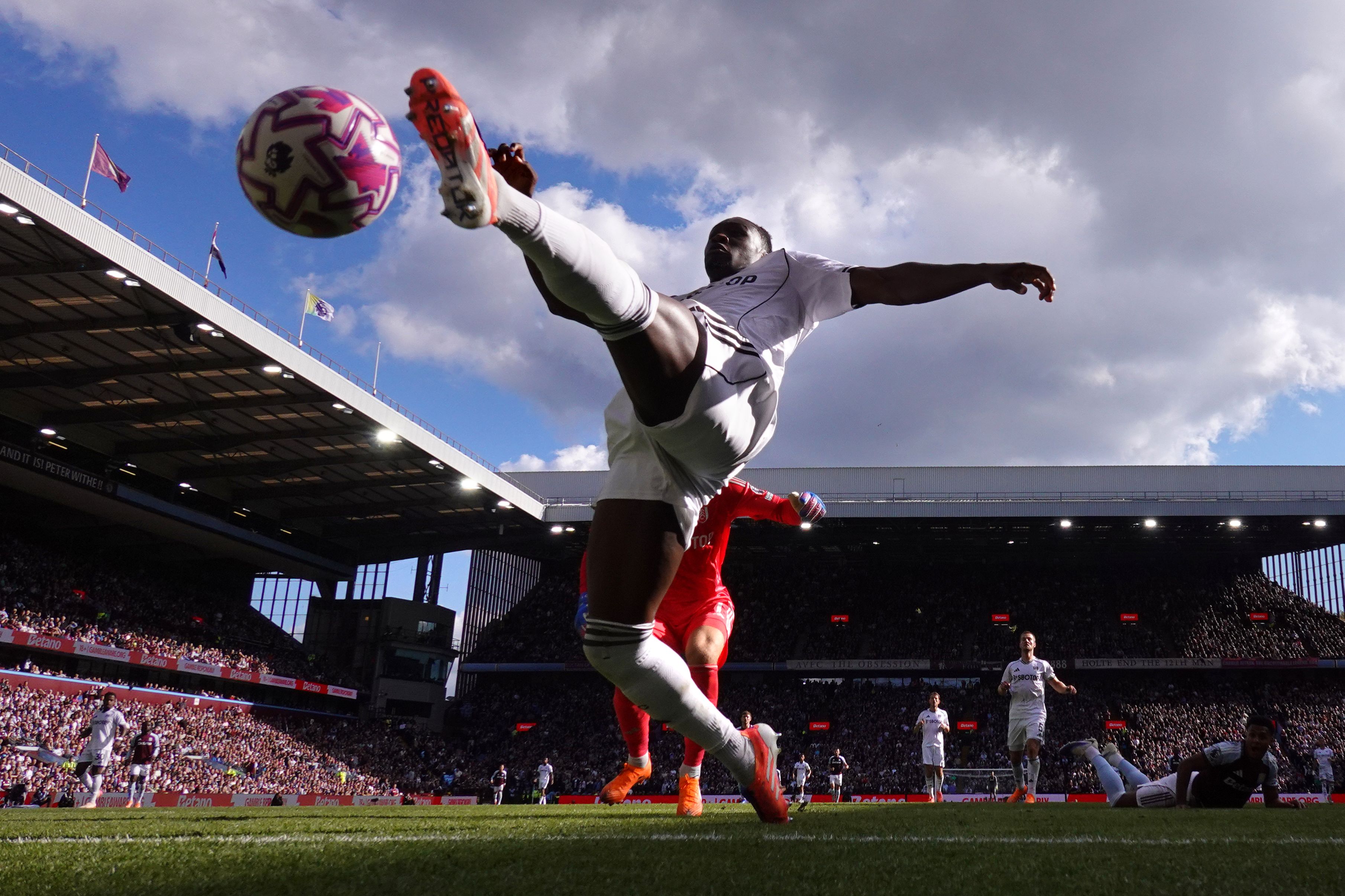 Calvin Bassey of Fulham attempts to clear the shot from Ollie Watkins of Aston Villa who scores his team's first goal during the Premier League match between Aston Villa and Fulham at Villa Park on September 28, 2025 in Birmingham, England. (Photo by Justin Setterfield/Getty Images)