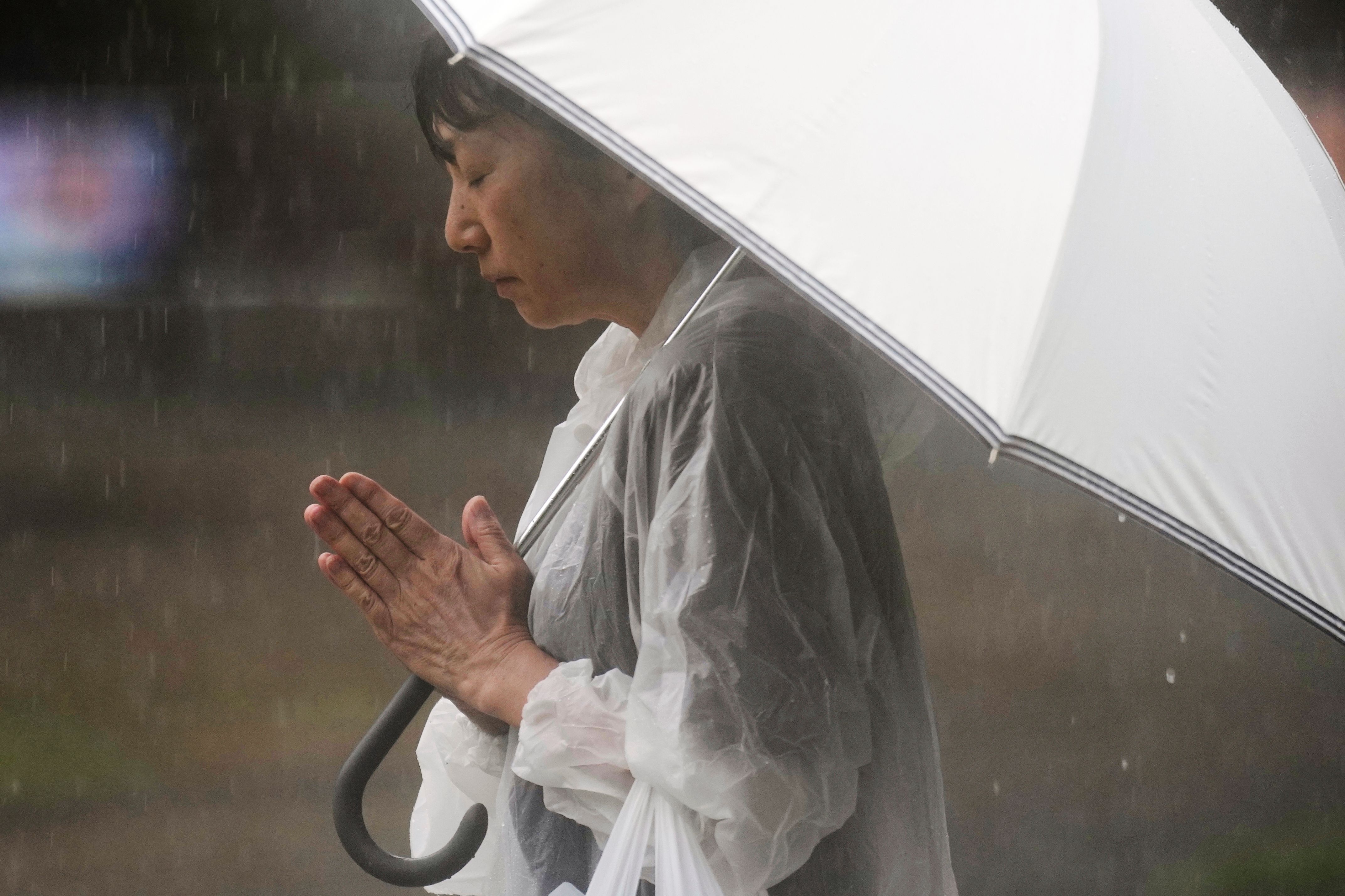 A person prays ahead of a ceremony to mark the 80th anniversary of the WWII U.S. atomic bombing at Atomic Bomb Hypocenter Park in Nagasaki, Japan, August 9, 2025. (Photo by Eugene Hoshiko/AP Photo)
