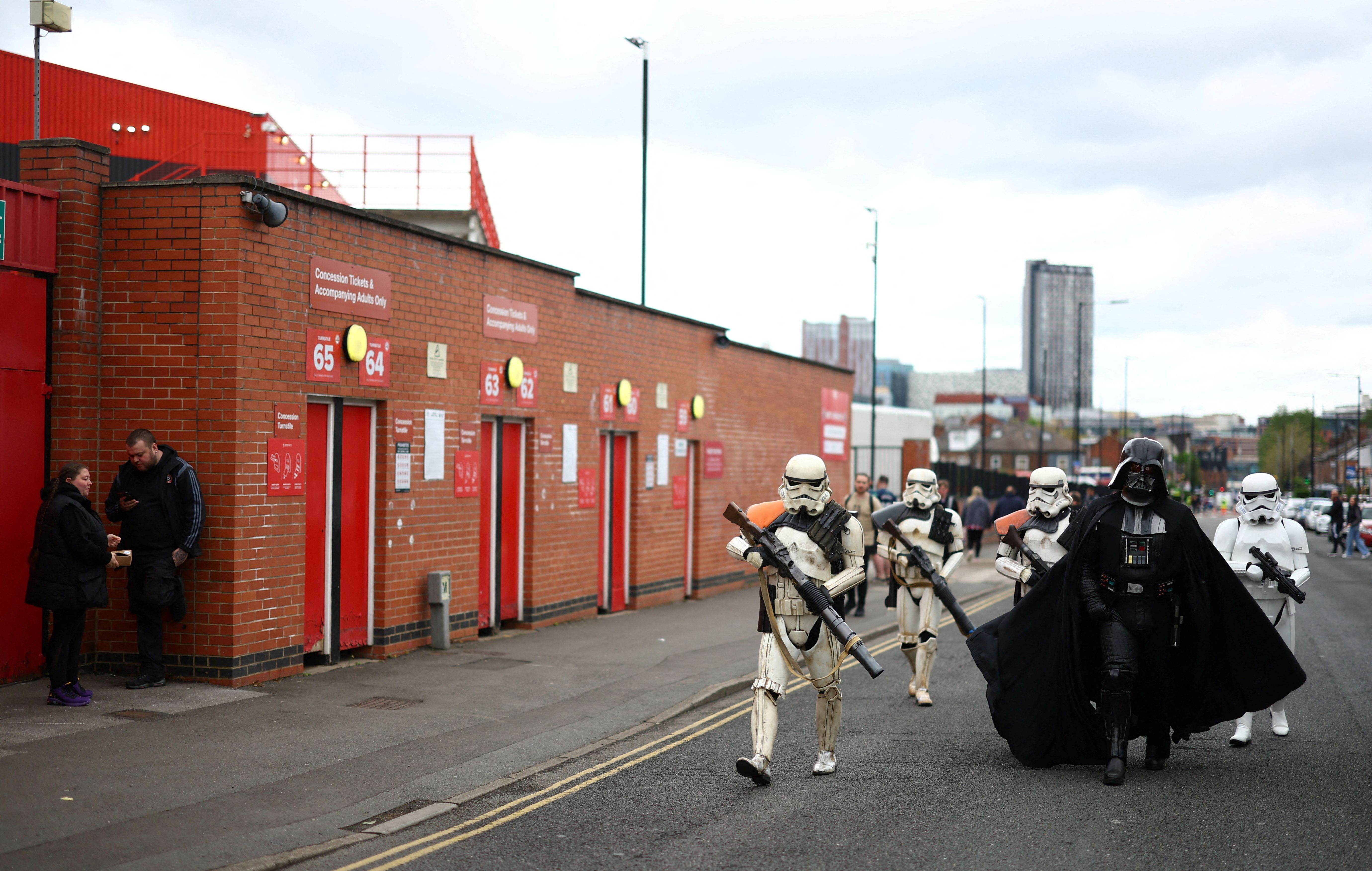 Fans dressed as Star Wars characters Darth Vader and storm troopers are seen outside the stadium before the match between Sheffield United and Nottingham Forest during Star Wars day in Sheffield, Britain on May 4, 2024. (Photo by Carl Recine/Reuters)