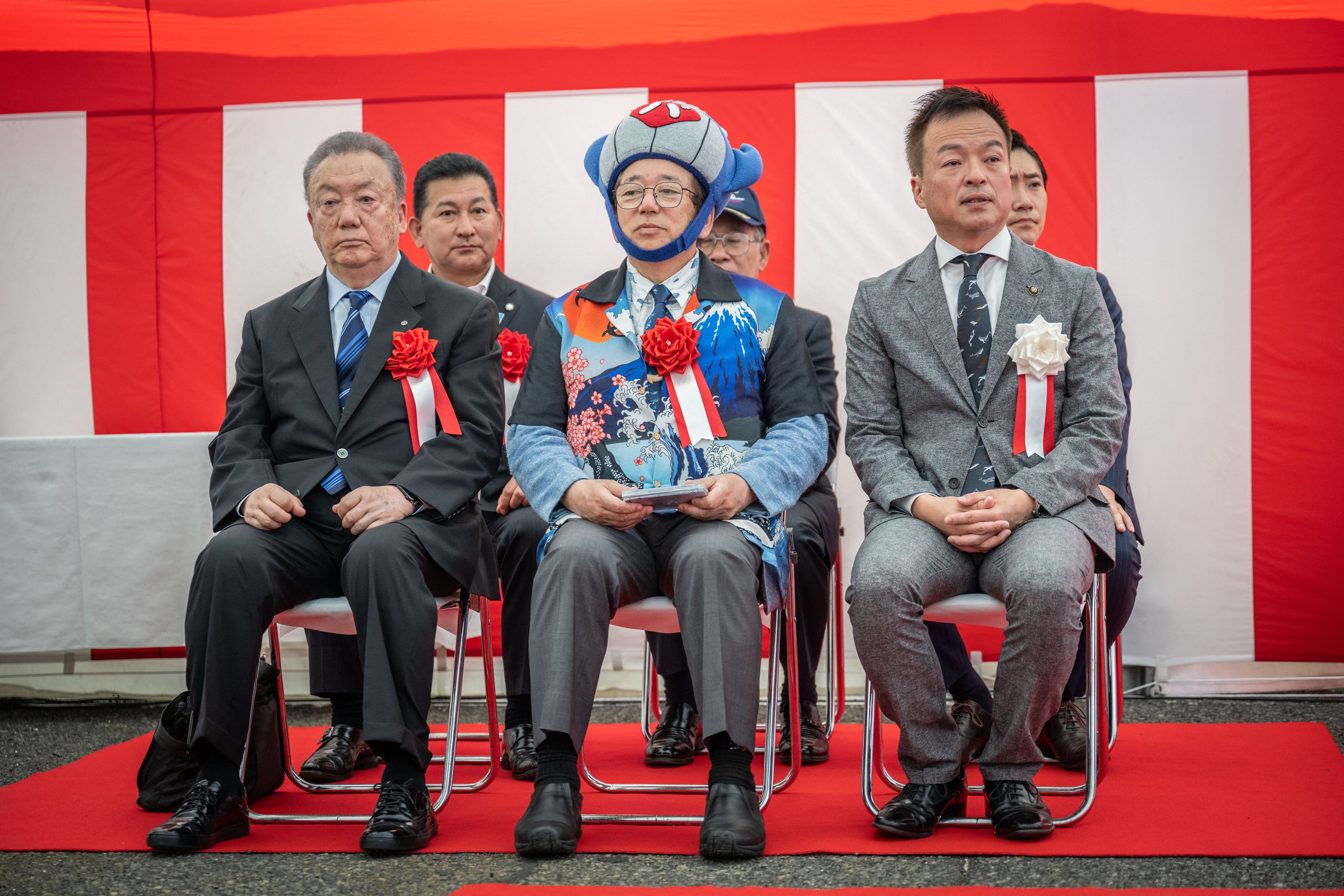 Hideki Tokoro (C), president of whaling company Kyodo Senpaku, and Shintaro Maeda (R), mayor of Shimonoseki city, attend a launch ceremony of Japan's new whaling mothership the Kangei Maru at a port in Shimonoseki city, Yamaguchi prefecture on May 21, 2024. The nearly 9,300-tonne ship set sail on its maiden hunting voyage on May 21, heralding a new era for the controversial practice defended by the government as an integral part of national culture. (Photo by Yuichi Yamazaki/AFP Photo)