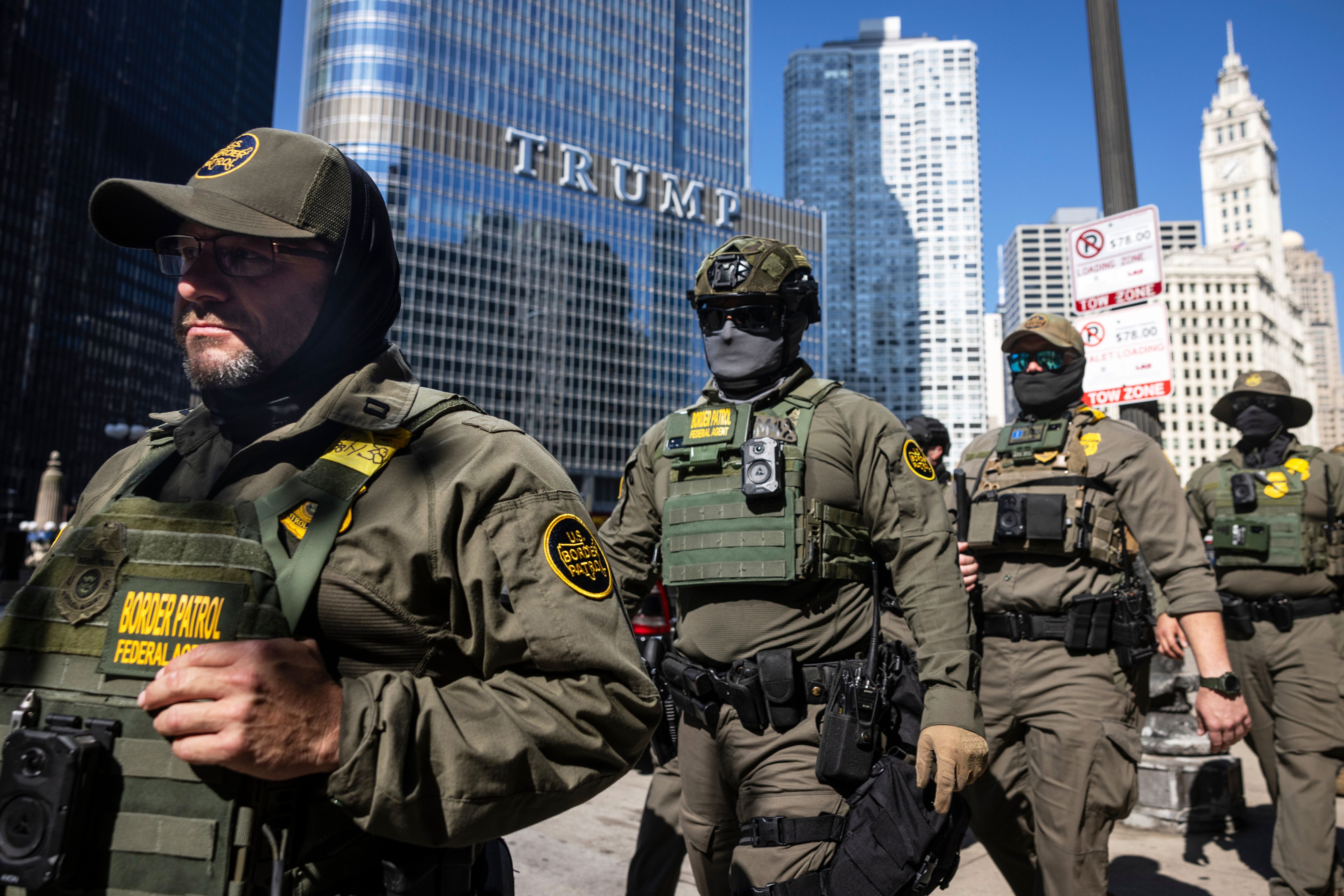 Federal agents from U.S. Immigration and Customs Enforcement and U.S. Customs and Border Protection walk along West Wacker Drive in the Loop, Sunday, September 28, 2025, in Chicago. (Phoot by Ashlee Rezin/Chicago Sun-Times via AP Photo)