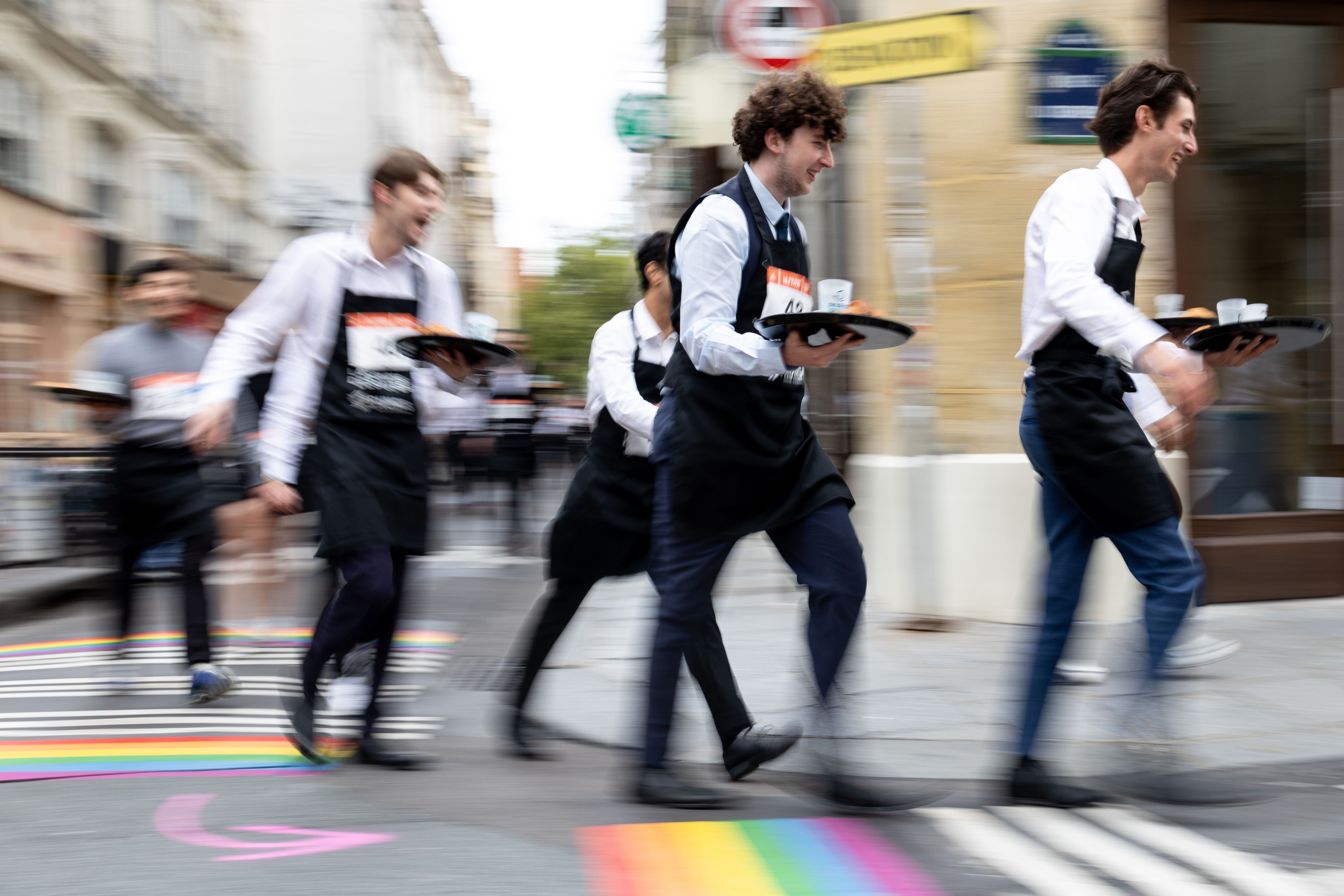 Waiters and waitresses race through the Marais district of Paris during “La Course des cafés” (The Cafe Race) on September 21, 2025 in Paris, France. Around 400 waiters and waitresses race through the streets of Paris, carrying a croissant, coffee, and glass of water on a tray, whilst wearing traditional hospitality clothing. The event is organised by the city hall and celebrates the heritage of French café culture and serves as a promotion for sustainable water consumption. (Photo by Tom Nicholson/Getty Images)
