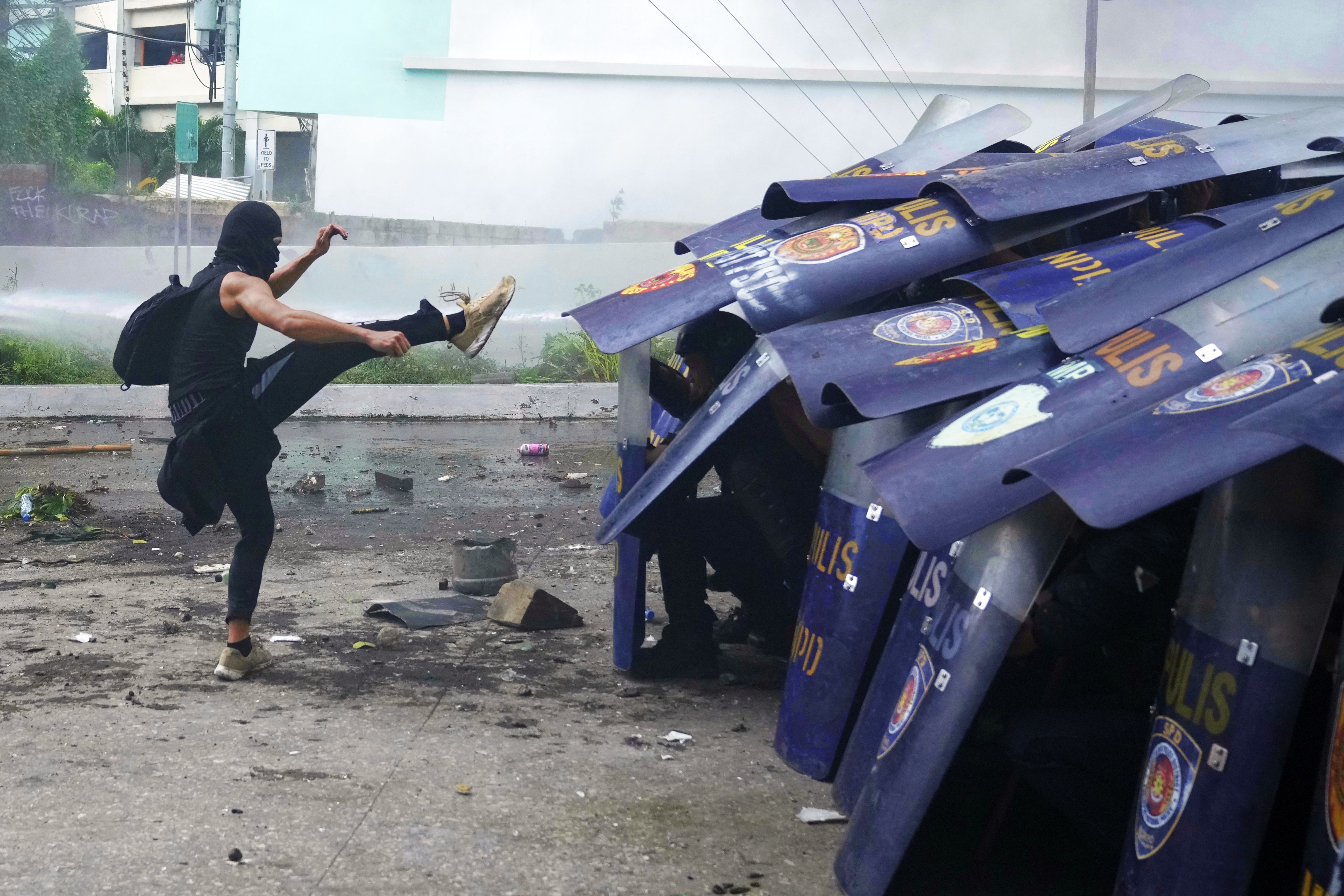 An anti-corruption protester kicks the shield of a policeman during clashes in Manila, Philippines on Sunday, September 21, 2025. (Photo by Aaron Favila/AP Photo)
