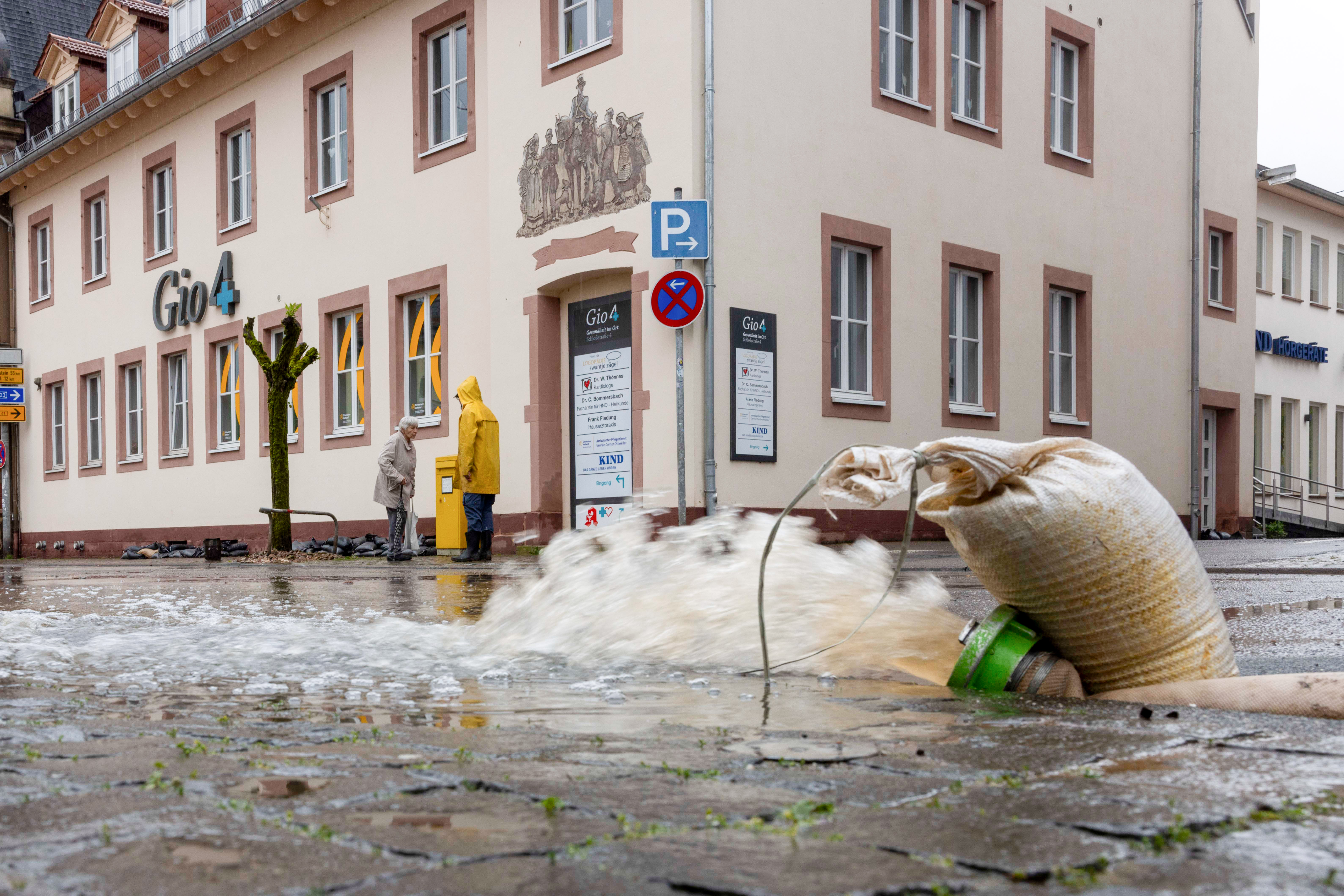 The water in the Blies in Saarland, southwestern German state bordered by France and Luxembourg, has receded on May 18, 2024, now the pumping out and cleaning of the streets and cellars in Quierschied begins. (Photo by Helmut Fricke/Avalon)