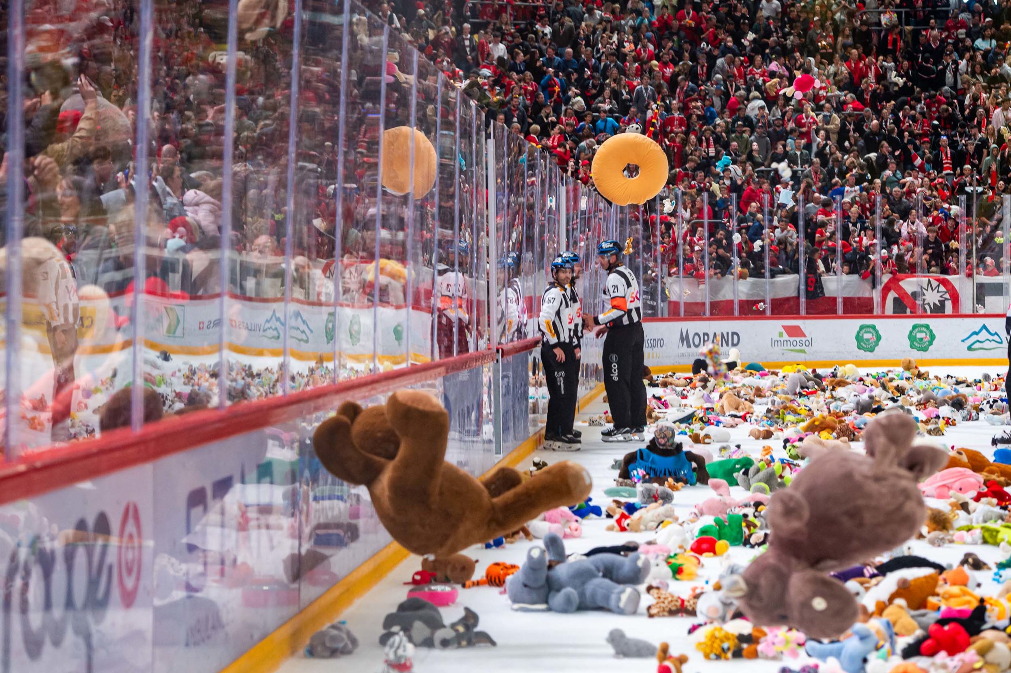Fans throw stuffed animals on the ice during a Swiss National League hockey game between Lausanne HC and SC Bern Lausanne, Switzerland, on Sunday, September 28, 2025. (Photo by Monika Majer/RvS.Media/Getty Images)