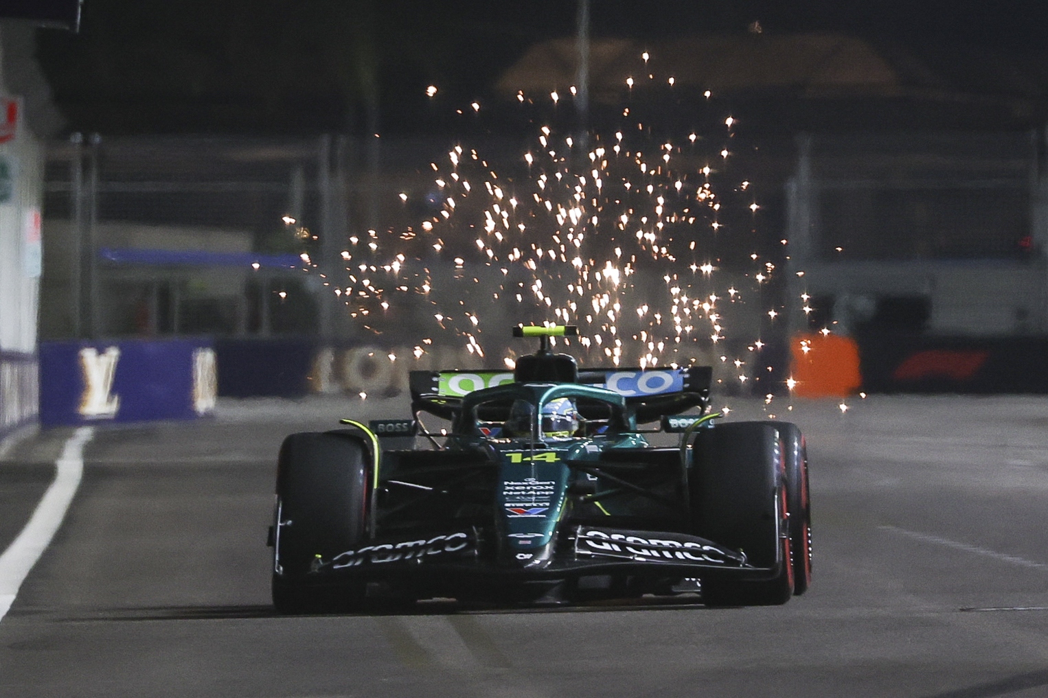 Aston Martin driver Fernando Alonso of Spain drives during a free practice session for the Formula One Singapore Grand Prix in Singapore, 03 October 2025. The 2025 Formula 1 Singapore Grand Prix is held at the Marina Bay Street Circuit on 05 October. (Photo by Fazry Ismail/EPA)