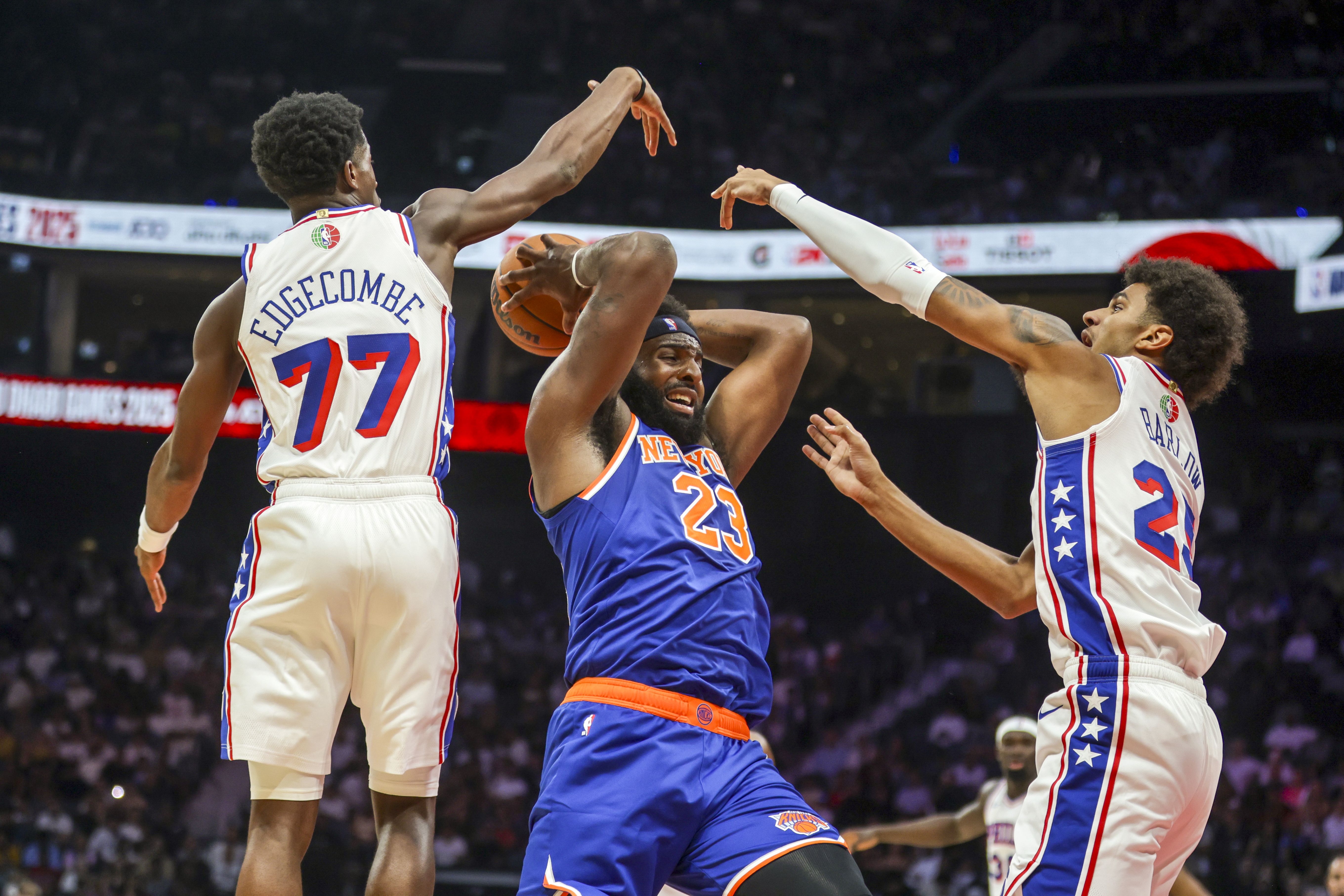 New York Knicks center Mitchell Robinsons (23) gets double teamed by Philadelphia 76ers VJ Edgecombe (77) and Dominick Barlow (25) during the NBA Abu Dhabi match at Etihad Arena on October 2, 2025. (Photo by Victor Besa/The National)